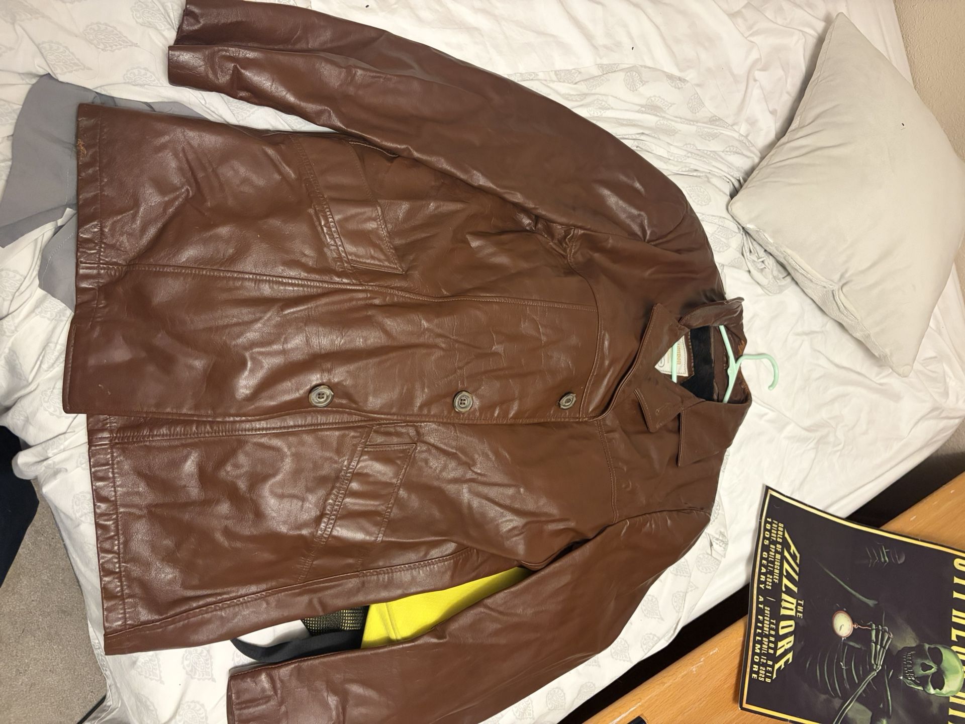 Genuine leather London Fog jacket/coat for sale. In good condition, no rips or tears, has all the buttons. Fits like a Large or Large Tall. Picked up from a pawn shop a while ago and never worn. If the ad is up it is still available.