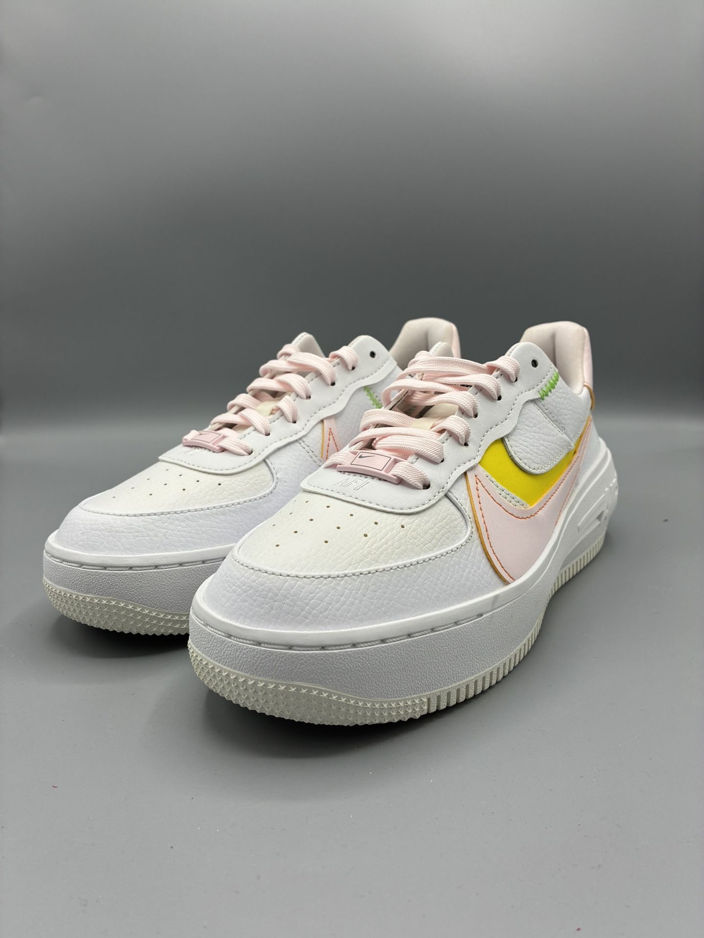 A clean white base sets the tone—crisp, breathable, and versatile. But it’s the pastel pink laces and soft yellow patchwork that bring warmth and charm. Orange stitching outlines the side emblem with a subtle pop, like sunlight tracing a silhouette. It’s a gentle clash of softness and edge, perfect for expressive styling. Material & Build • Upper: Smooth synthetic with perforated toe panels for airflow and texture. • Laces: Pale pink—playful, delicate, and unexpected. • Details: Yellow patch near the side emblem adds contrast; orange stitching gives it definition. • Midsole & Outsole: White rubber with textured grip—clean and functional. Design Language This high-top silhouette blends classic structure with modern color play. The pastel accents soften the bold shape, making it feel approachable yet distinct. It’s a shoe that balances sweetness with streetwear grit. Fit & Flow Unisex by nature, with a supportive high-top profile that suits a wide range of wearers. Ideal for casual fits, layered looks, or anyone who wants their footwear to whisper style with confidence.