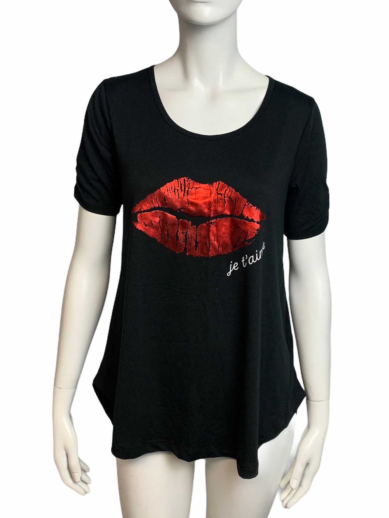 LulaRoe Women’s Black Shirt Super comfortable Red kiss lips perfect for Valentine’s Day Says ” je t’aime “ in French Size reads 2 x-small but fits my small mannequin. New with tags Check out my other posts Send me an offer 😊