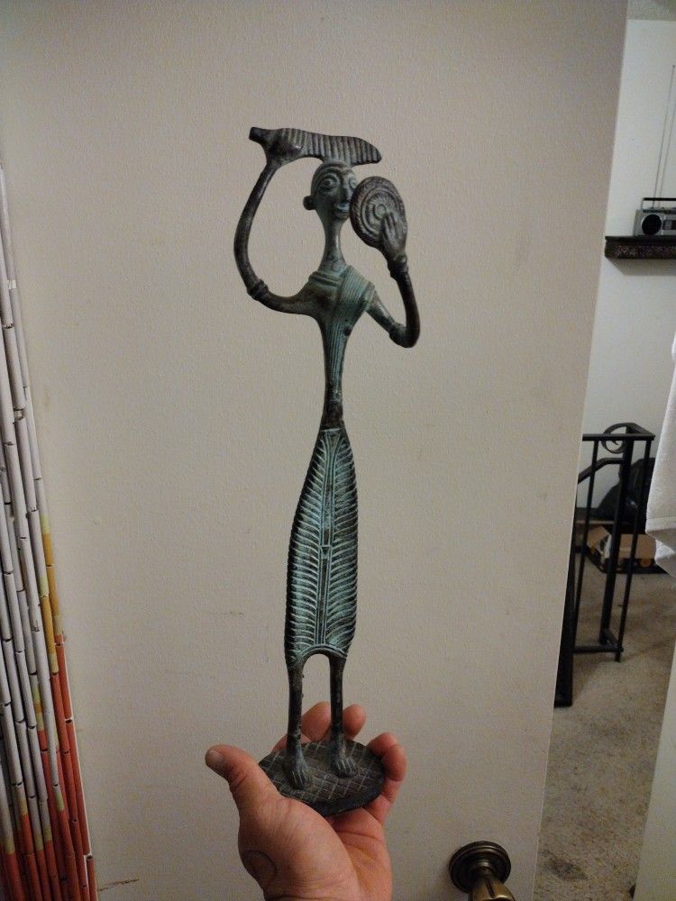 Antique sumerian? Dohkra?.. brands bronze statue about 30 to 40 in tall women with a mirror and comb beauty statue
