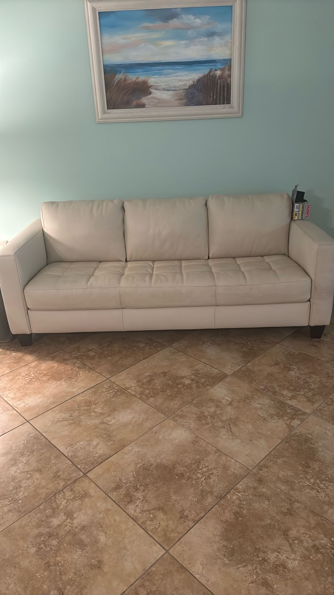 White real Leather couch and matching chair. Needs a deep cleaning Local pick up only