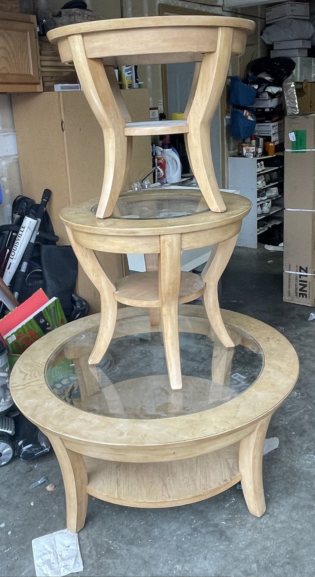 1 oak/glass round coffee table 2 oak/glass round end tables