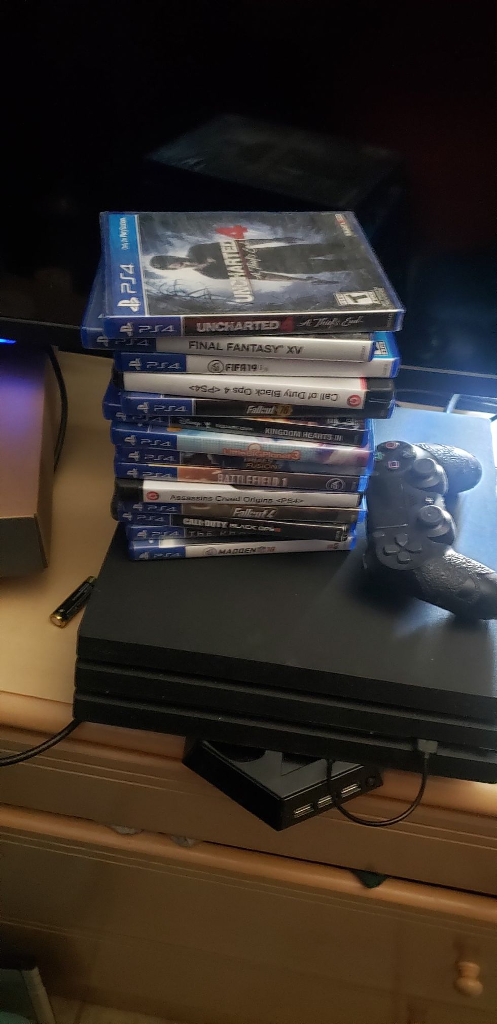 PS4 Pro, with 1tb ztorage and games. Looking to trade for Squat bar with weight plates or other home gym equipment or a VR set Works great, bought in quarantine and barely used it. Dont need to sell so no lowballs