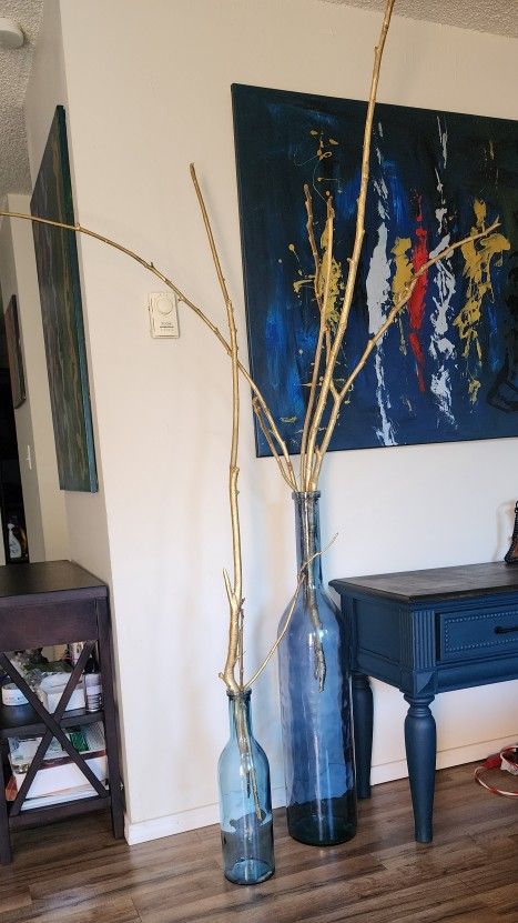 Larger bottle is 40 inches and smaller bottle is 20 inches. The sticks are pretty much spray painted gold. You can have the bottles with or without the sticks. Can deliver for a small fee within reasonable distances.