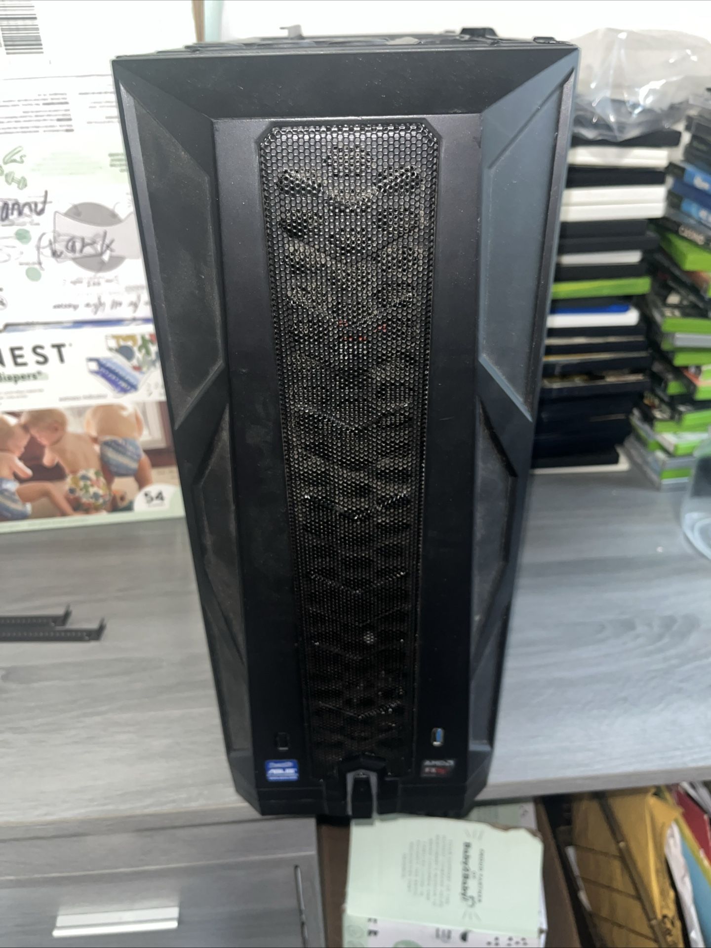 Used mid-tower gaming case with a Turtle Beach sticker panel. Comes with rear cooling fan, front mesh panel for airflow, and pre-routed cables. No motherboard or internal components included – case only.