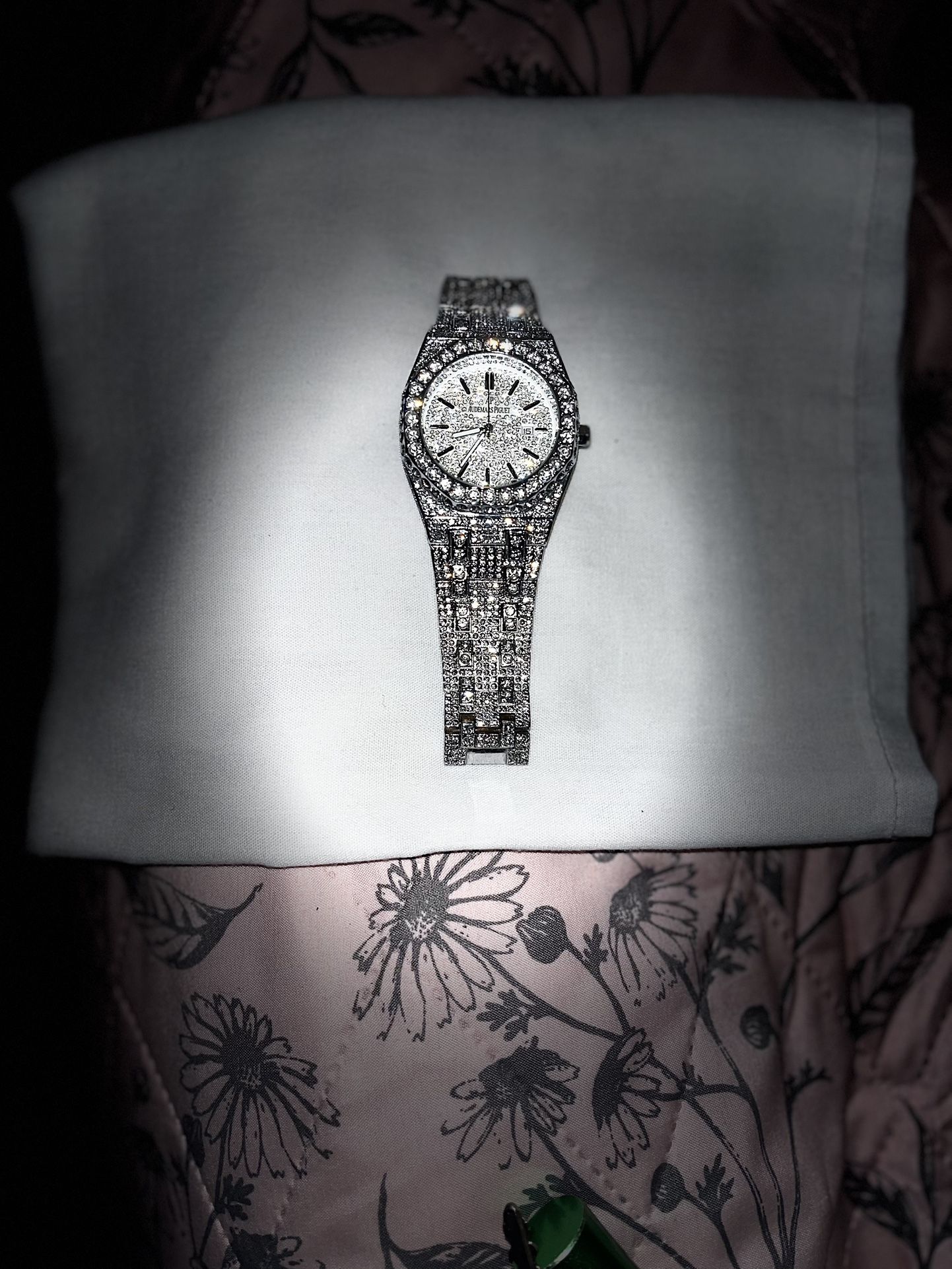 bust down AP watch featuring moissanite set into a stainless steel base with gold plating