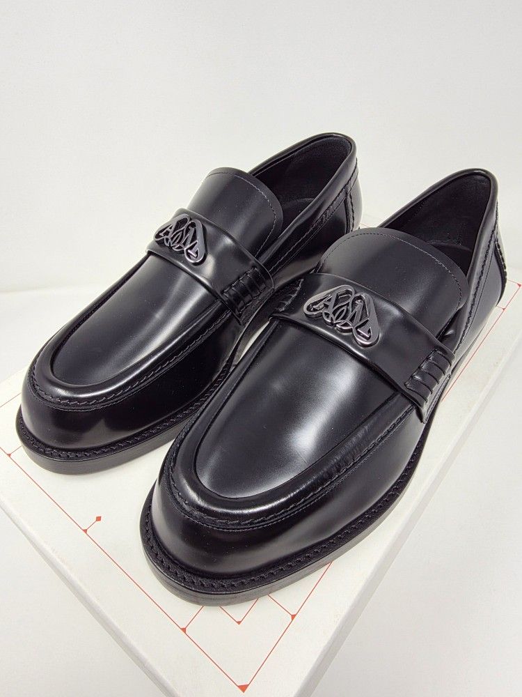 Retail: $990 Style Code: 777805 WIES2 069 Condition: New w/ Dustbag + Box Size: EU 42 / US 8.5-9 / UK 7.5-8 Description: Elegant black loafers with a glossy finish. Featuring signature McQueen detailing. Ideal for formal and business casual wear. Made In Italy