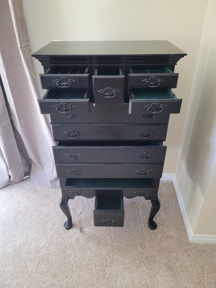 *CAN DELIVER FOR A FEE* True antique highboy jewelry/accessories armoire painted high-gloss black for hollywood glam/gothic effect. Gorgeous piece for any collector or appreciator of quality, vintage furniture. ▪︎9 fully removable drawers, all lined with original vintage green felt (2 small bottom drawers are just for show/do not open - seen in photos). ▪︎3 extra felt separaters included (and shown in photos). ▪︎2 of the 9 drawers (middle section) are large and very deep (and be used for clothing). ▪︎There are 4 hardware handles on the left side that have broken, but do not effect opening or closing of any drawers (you can see them in the first photo when zooming in a bit). MEASUREMENTS: Height= 46" Width= (at widest point) 26" Depth= (at widest point) 16.5" gift, present, xmas, christmas, hanukkah, birthday, bday, anniversary, special occasion, bedroom, closet, dresser, drawers, lingerie, organize, storage, furniture, valuable, collectible, interior design, chest, victorian, queen anne, french provincial, chippendale, 18th century, gothic, gothik, gothique, old hollywood glam