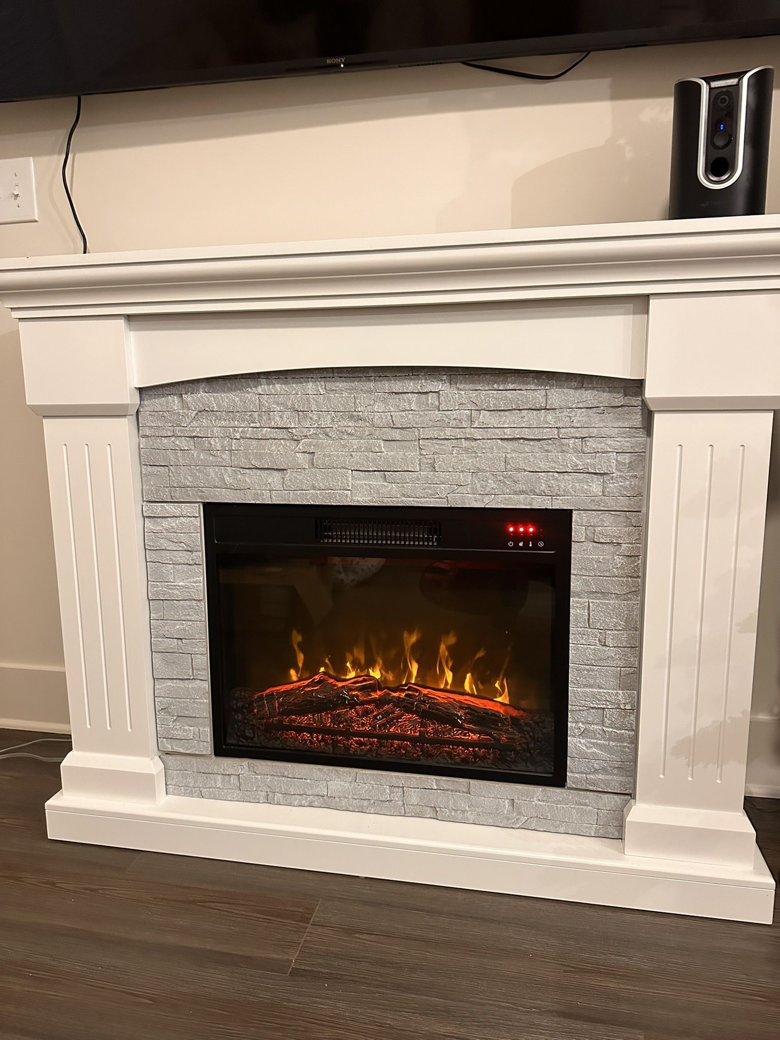Fake fireplace with real heat. Minor scratch. No longer have remote, however the buttons work. Original price $750 47.5in across 37.5in tall 11.5in depth $450 OBO.