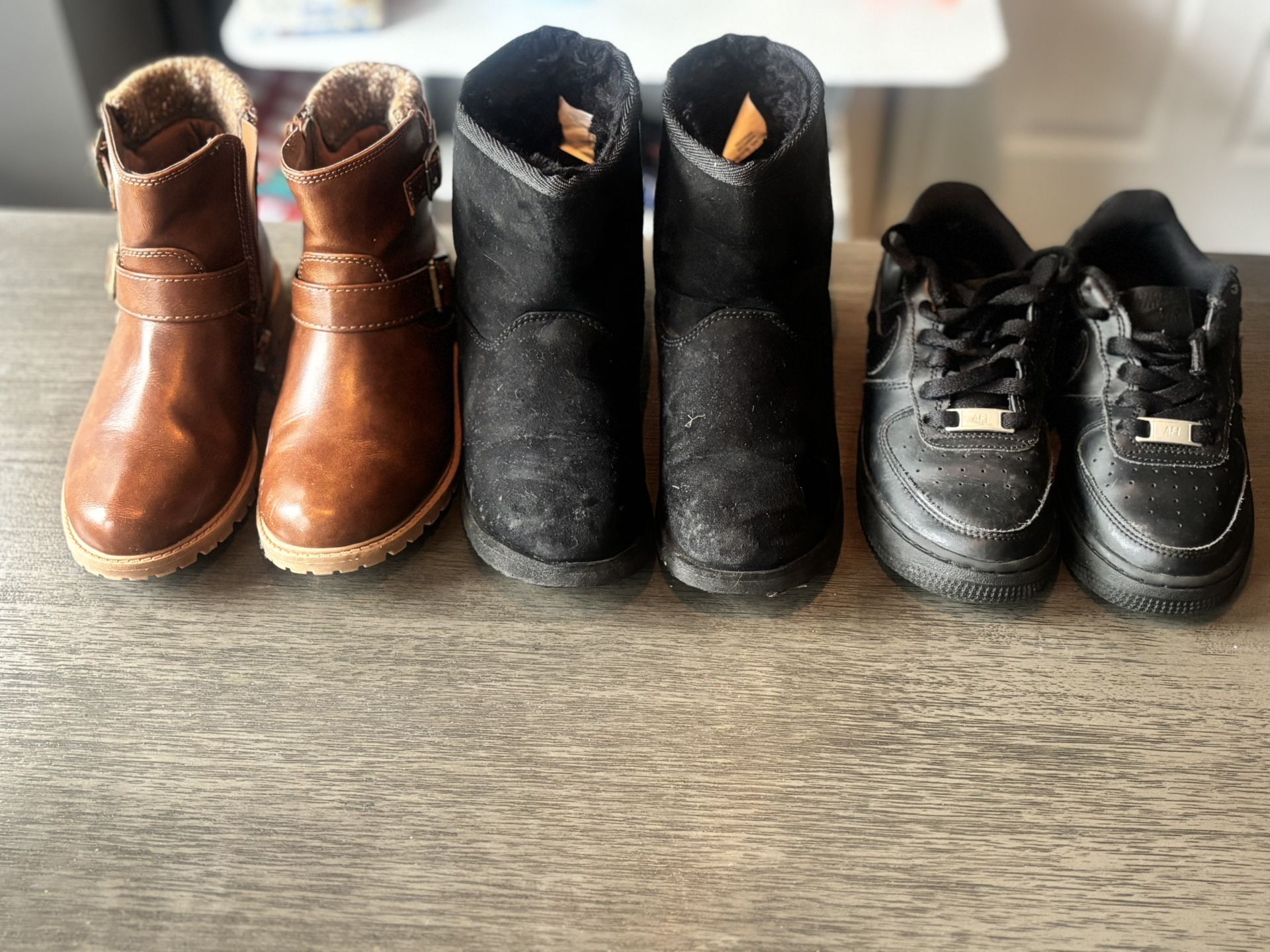 Normal wear, my daughter just outgrew them. Nike size 1. Brown and black boots size 2