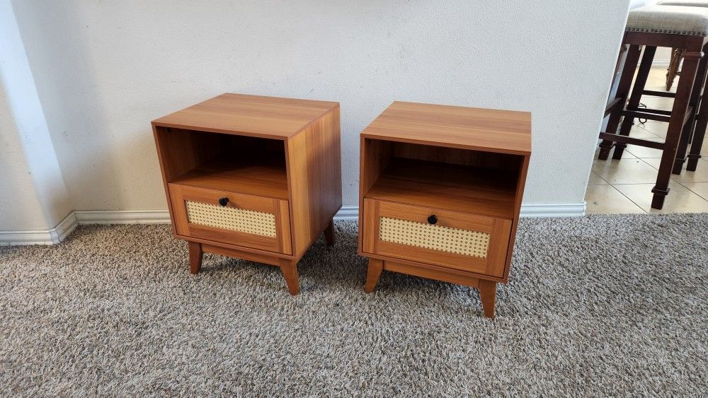 Set of 2 Mid-Century Modern Style Wooden Small Nightstands/End Tables with Rattan Drawers and Solid Wood Legs. Each nightstand measures: 17.75"W x 15.75"D x 22.5"H. These are cute and sturdy nightstands with a beautiful design. The drawers are very smooth and work perfectly. They're perfect for a bedroom, kid's room or living room. Great for apartments and small places. They're both in great condition, never used. I'm asking $100 for the set. Cross posted. Located in Katy, near 99 and Morton Ranch Rd. Serious buyers only please.