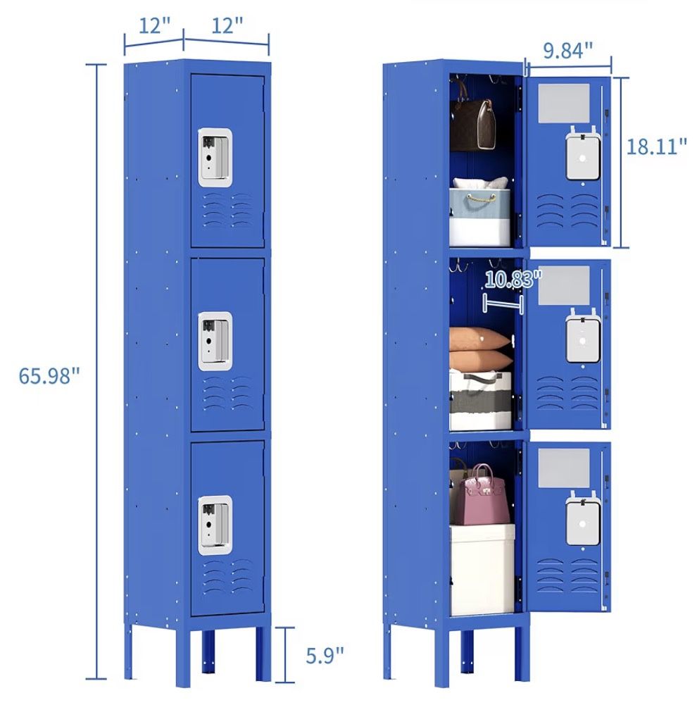 Rufus AI 【Spacious Storage Space】This metal locker features three storage compartments. With dimensions of 12"D x 12"W x 66"H, it provides ample space for the individual storage of various items. This 3 door lockers is suitable for use as employee lockers or as a home office, school, or gym locker. 【Premium Quality】The BIZOEIRON metal storage locker is constructed from high-quality steel, ensuring exceptional rigidity and durability. All metal plates of the locker cabinet undergo electrostatic spraying treatment, which enhances resistance to corrosion caused by moisture in the air. 【High Security】The doors of this metal locker are made from thickened steel, providing sturdiness and resistance to damage. Each door can be locked independently, ensuring that your belongings stored within the cabinet remain secure. 【Multi-Purpose】Designed with simplicity and practicality in mind, this 3 door metal locker offers excellent individual storage functionality. It is widely applicable in offices, schools, gyms, and homes to meet diverse storage needs. Ventilation holes on each doors keep the air fresh, hooks in each cube provide hanging function.