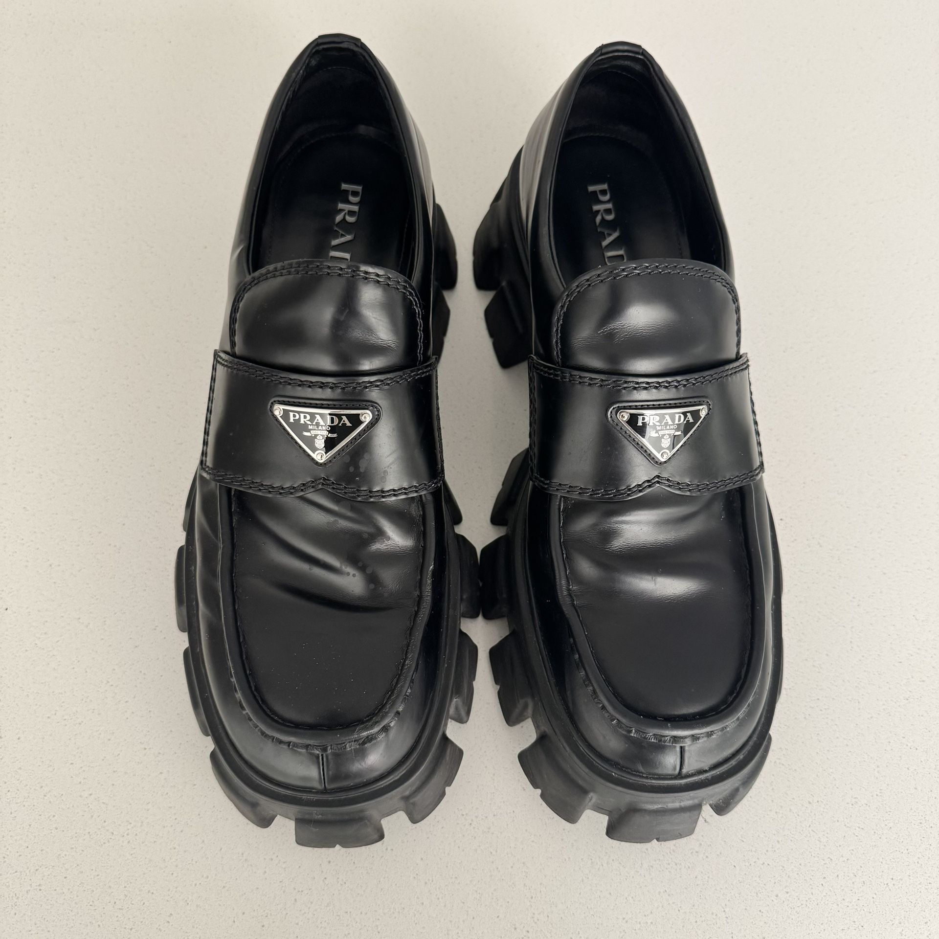 Authentic Prada Monolith brushed-leather loafers in good condition. Retail price is $1,300. Great opportunity for shoe re-sellers! Details: • Size 12 • Good, gently used • No major scuffs or flaws • Normal wear on soles • Original receipt available for proof of authenticity • Smoke-free home • No box These are hard to find in size 12 and priced to sell quick. Price: $400 (firm) Pickup or shipping available. Message me with any questions — serious buyers only.