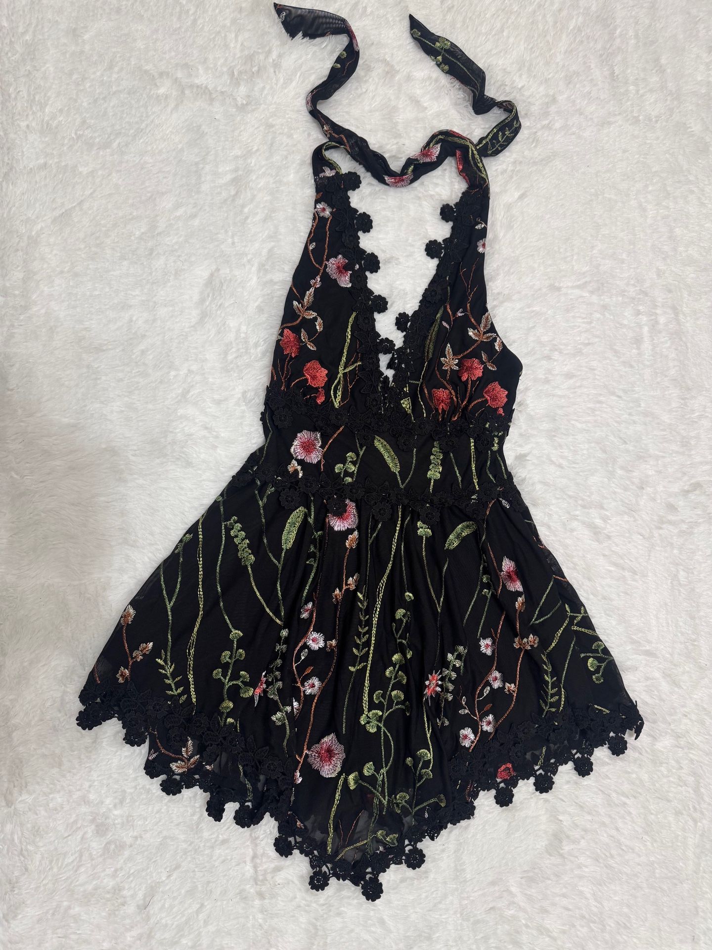 New large black lace embroidered floral dress boho festival halter short flower