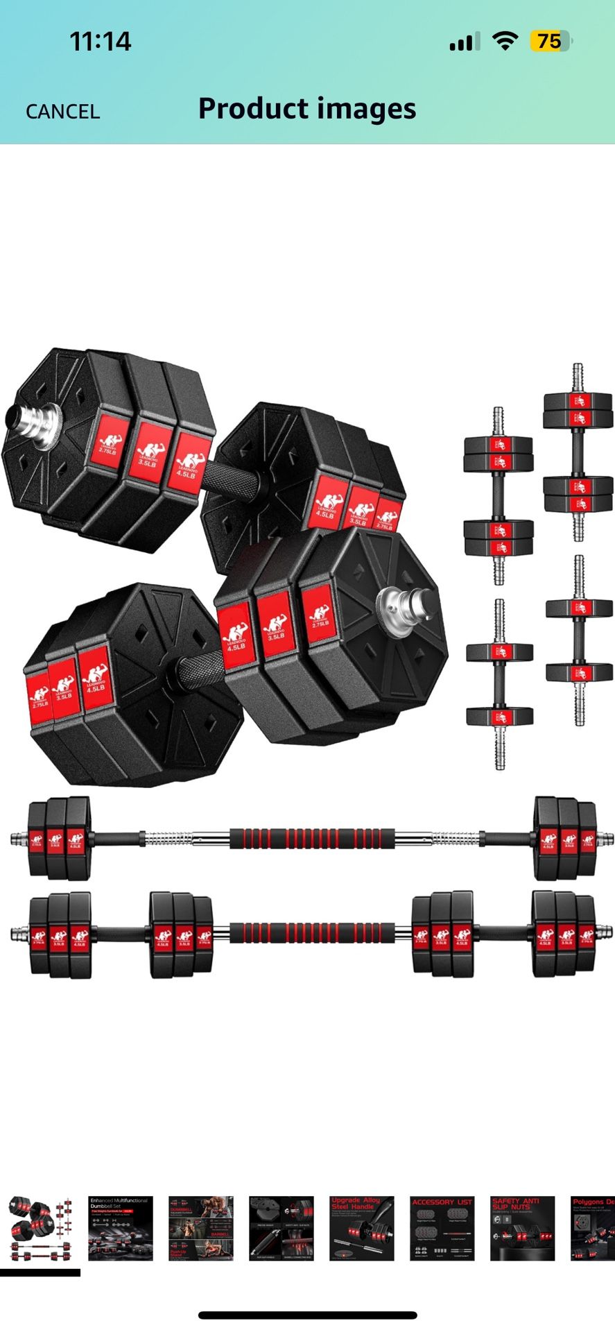 Brand new never used Retails $130 Asking $70 3 in 1 DUMBBELL SET: This adjustable dumbbell set total weights are 66pounds. You can adjust the weight of the dumbbell according to your needs. The dumbbell is equipped with a connecting rod. You can convert it into a barbell in a few seconds, which can meet the exercise needs of upper and lower limbs. Helps to tone and shape the arms, shoulders, back and strengthen your muscles. Multifunctional strength training equipment provides a better training method than any other sports equipment. ERGONOMIC DESIGN: The ergonomically grip rod, with a diamond-shaped cross texture on the surface, and has a better grip. The connecting rod has a thickened sponge that can prevent slippage, absorb moisture, and wick away sweat, making your exercise more comfortable and safe. SAFE and DURABLEThis adjustable 3 in 1 dumbbell set is made of durable PE material. Unlike iron dumbbells, it will not scratch the floor. It is very safe and durable. The octagonal design of the Dumbbell plates can prevent it from rolling, More stable. And we upgraded the nut, installed non-slip screws, double fixed, more secure. LIFE IS MOVEMENTLife is movement , and everyone dreams of shaping a perfect physique. We often can't keep exercising because we need to go to the gym. But this adjustable dumbbell can make you free from these troubles. It is very suitable for home, office and gym exercise. It is also the best choice for gifts to relatives and friends.