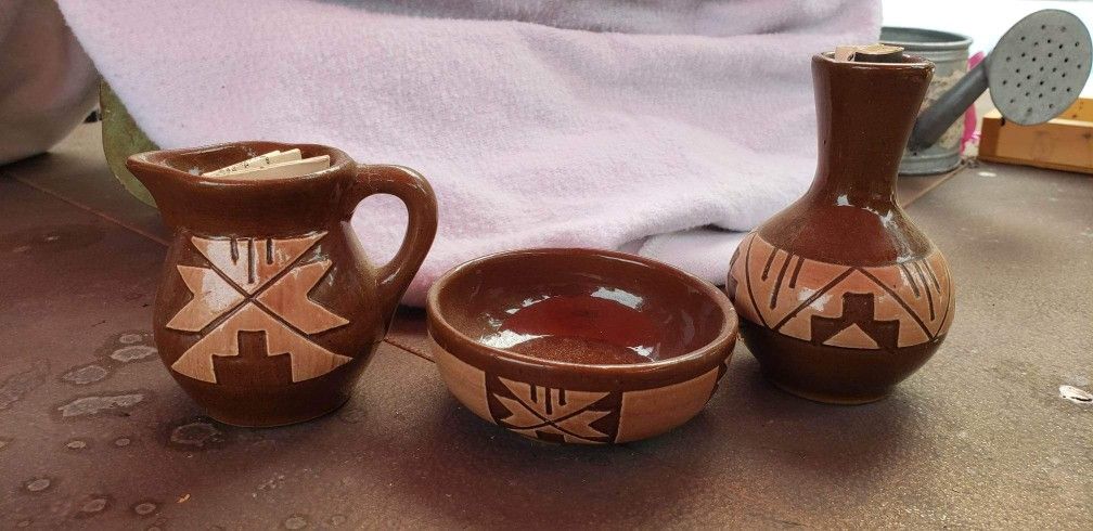 Vintage SIOUX POTTERY Vase, Pitcher, Bowl - Blacktail DEER MADE. Native American made pottery. Signed on the bottom. 2 of the pieces have their paperwork from the shop. No chips, cracks, or breaks I see 9r feel. Great design around all 3 that seem to match Measures- between 1.5" Tall and 4" Tall $85 for all 3 pieces shown