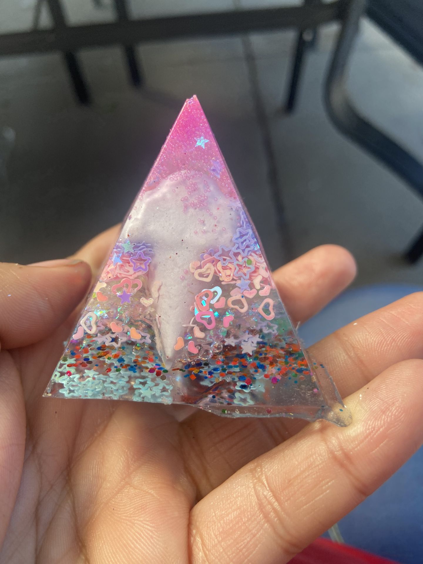 Brighten up your space with this 100% handmade resin pyramid! This piece features a gorgeous pink-to-blue ombre effect and is packed with iridescent heart and star confetti. It catches the light perfectly and makes for a super cute desk accessory or shelf decor. • Condition: Brand New / Handmade • Aesthetic: Kawaii, Y2K, Sparkly • Details: Multi-colored glitter base with suspended 3D heart and star shapes. • Dimensions: Fits comfortably in the palm of your hand (perfect for small spaces).