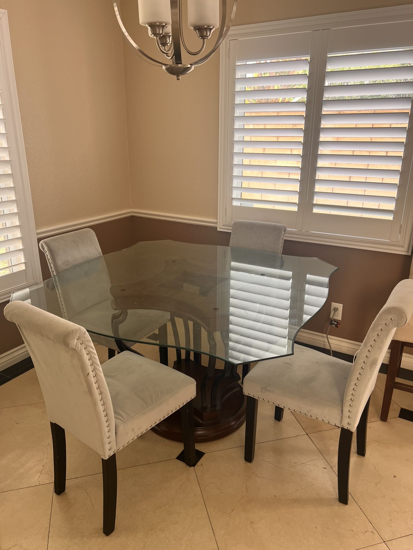 This is a heavy duty wood/glass dinning table set. Will give all (4) chairs included with the dinning table. Need gone asap as I’m buying new furniture. Classy wood bottom base with a fancy heavy duty cut glass top. Seats (4) OBO$