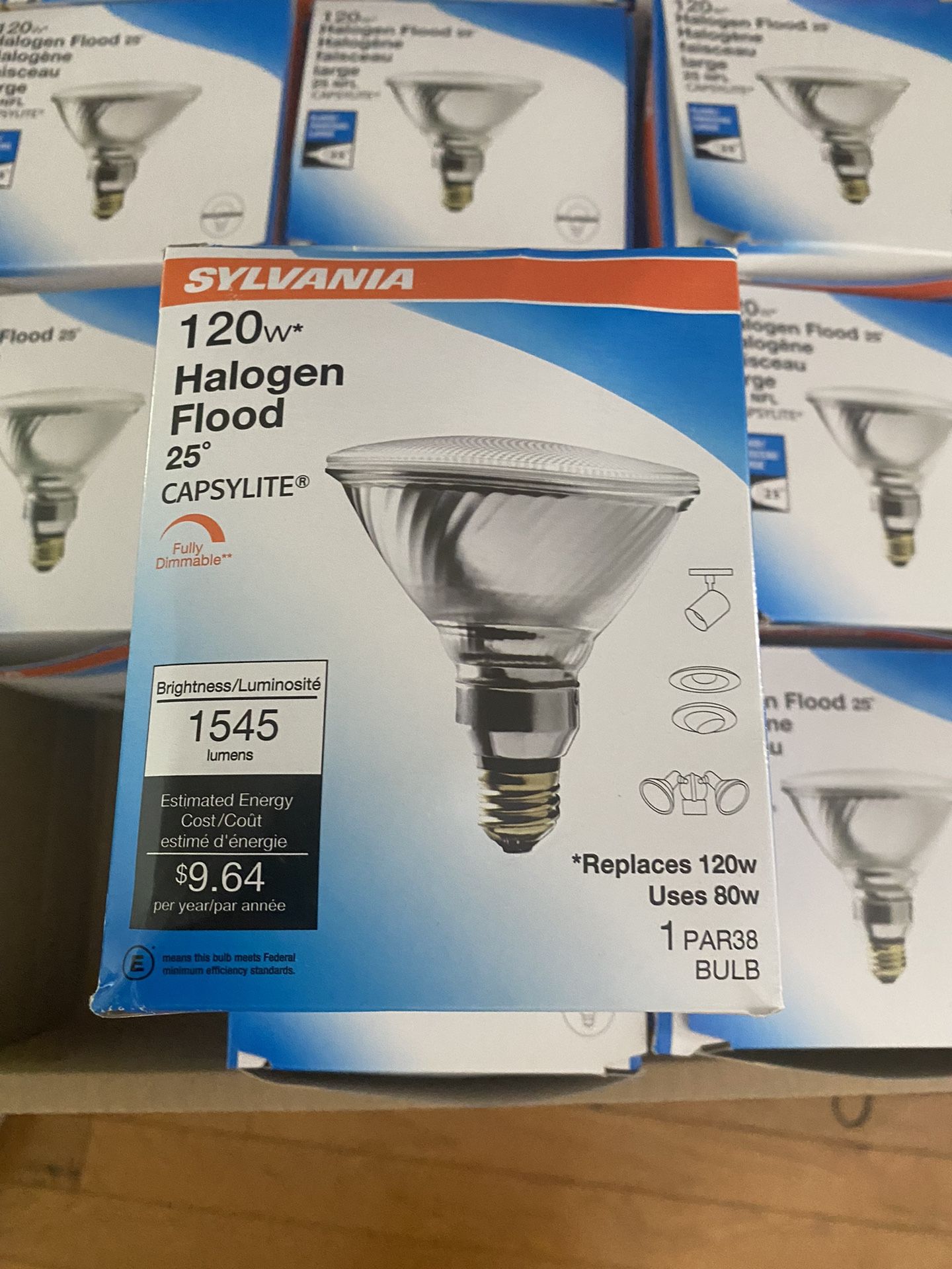 $5 EACH. Brand new unused Sylvania Par 38 Halogen flood/spot lights 1545 Lumens Uses 80W no longer available in California. I have 60 of them. Selling for $5 each. I paid $15 each.