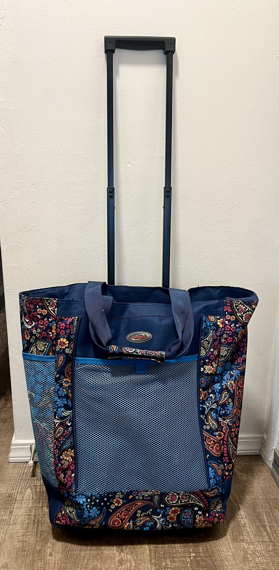 Featuring a colorful paisley print and a retractable handle for easy transport