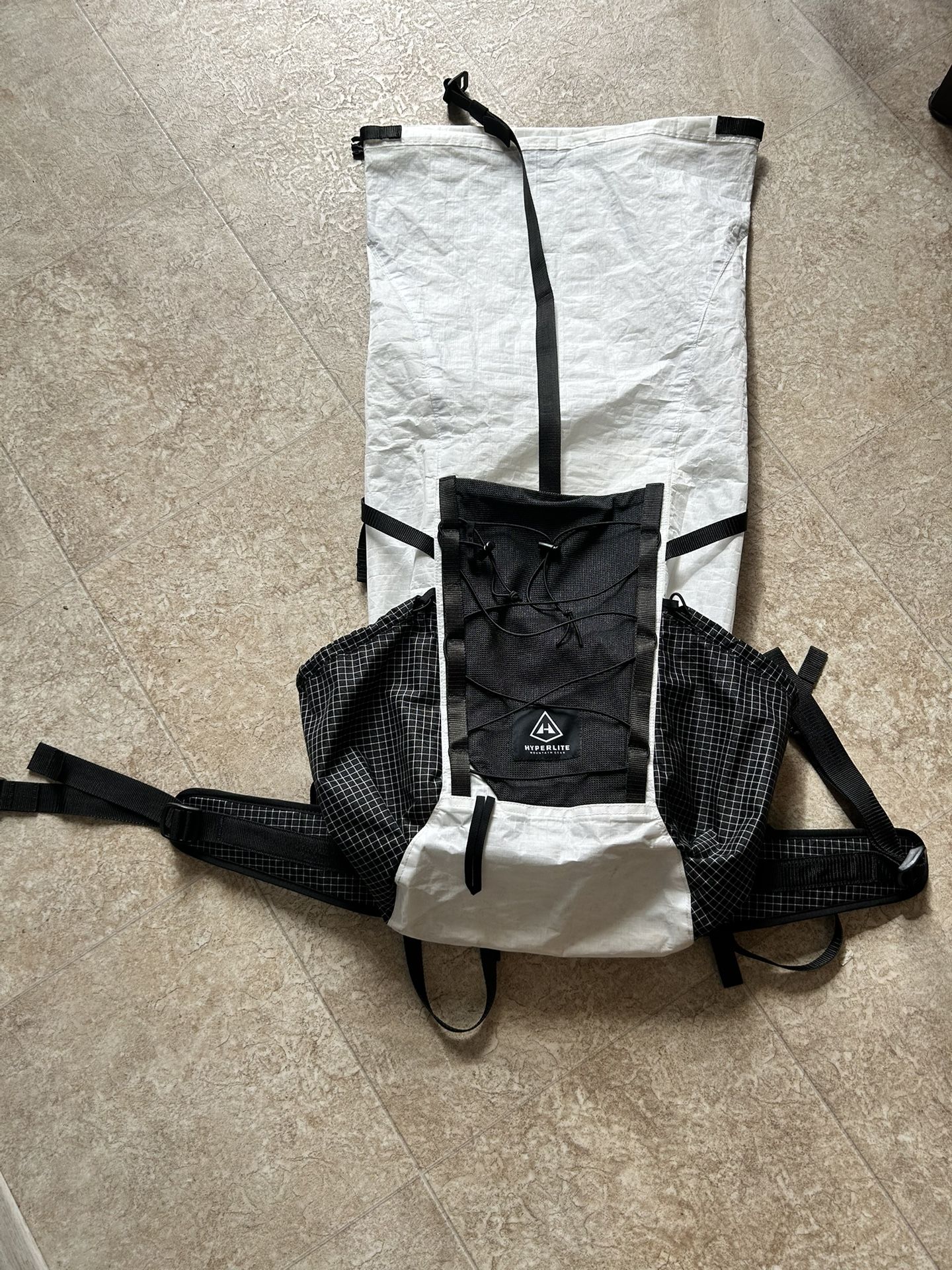 Brand New!! Ultralight 22L daypack is made from durable white Dyneema Composite Hybrid material. This is a size medium with black accents and a large external mesh pocket. It has padded shoulder straps, a sternum strap with an integrated whistle, and a removable waist belt. The roll-top closure and water-resistant fabric make it great for all-weather hiking.