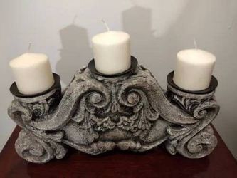 Will remove when unavailable. $100 In- Exact -Cash. $100 Firm. ~ See 8-7:45 any day. ~ No candles, candle holder only, candles not included. Heavy beautiful tuscan style horizontal polystone faux stone candle holder mantle, shelf, table. Rare style candle holder, very nice home decor. Made in the Philippines. Grey and black distressed, pics show variations of how lighter or darker it can look, this is contingent on lighting. Weighs roughly 8 lbs, quite heavy . 20" long, 10.5" high at the center, 4" deep. Really nice home decor, the front and back are the same. Excellent condition, the only signs of wear is some candle smudges residue on the candle pans from candles. ~ *Firm Price, NW OKC. If price isn't a fit for you please do not inquire|Meet!* * Please no holds!