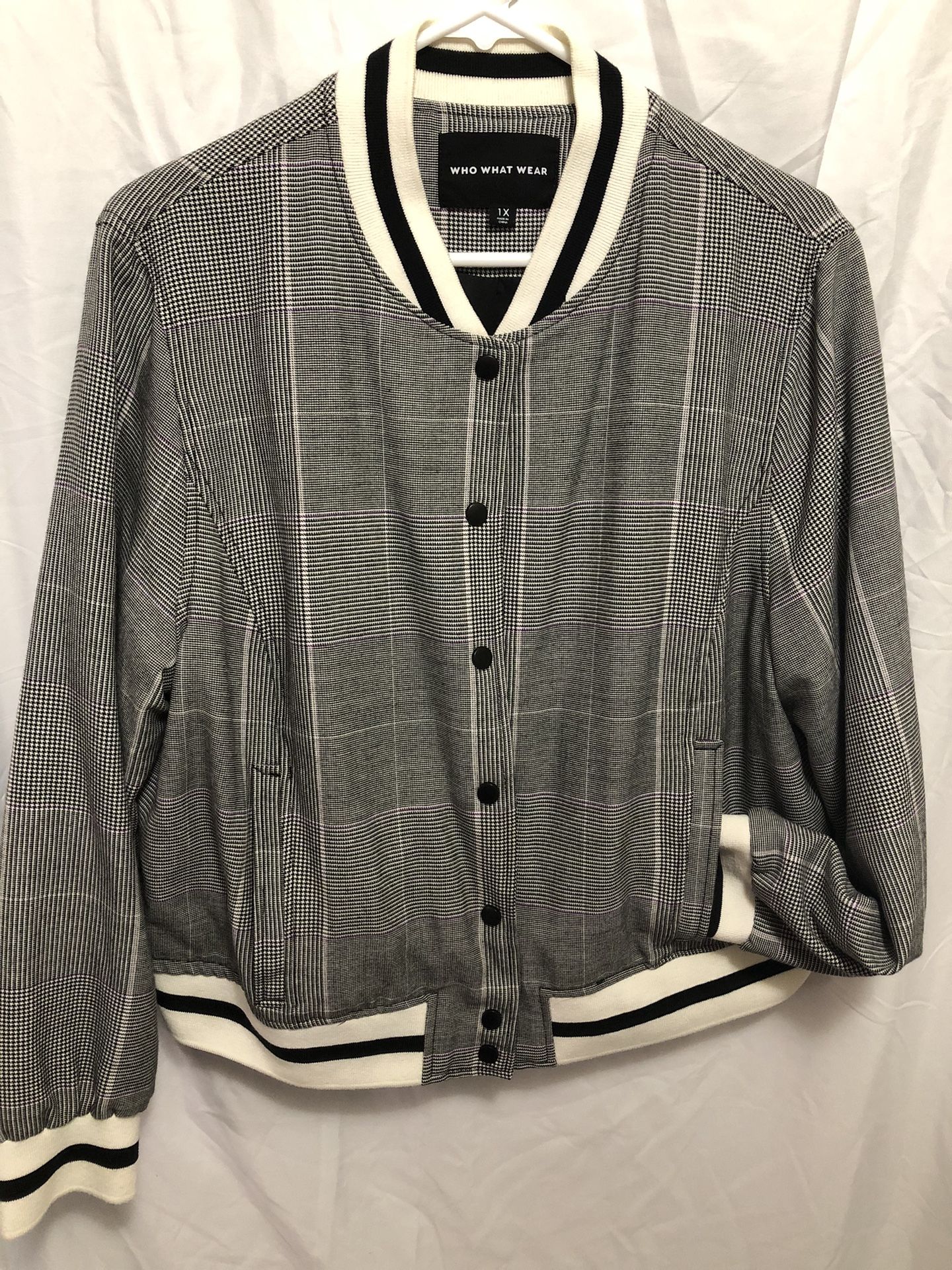 Women’s jacket Fabric- polyester, rayon and spandex Size 1x fits more like a large or extra large Plaid button up with pockets Worn twice