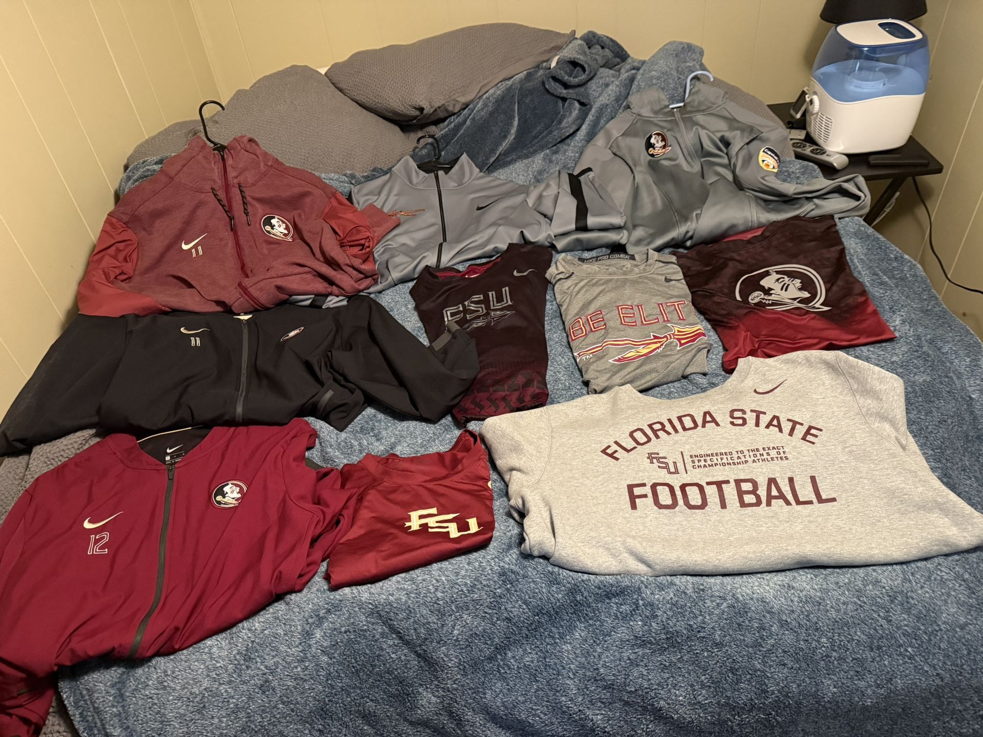 Football team issued gear Travel jackets Pants Shorts Workout shirts Shoes Hats Lots of stuff let me know what you like and I send you sizing of it