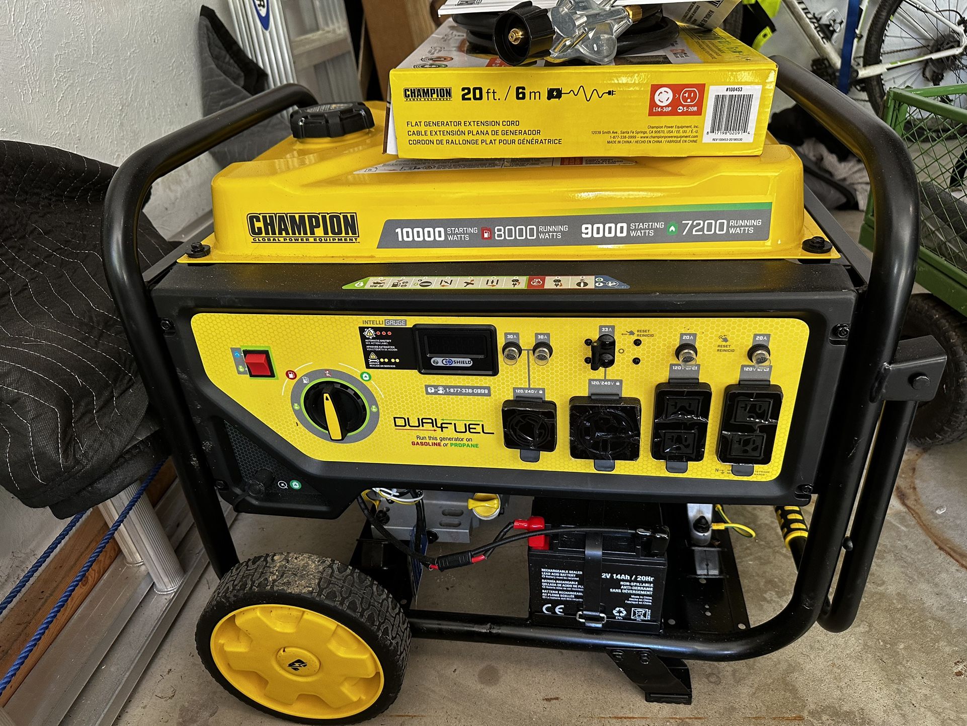 Champion Power Equipment 10,000-Watt Electric Start Dual Fuel Home Backup Portable Generator with CO Shield. Paid $1,100.00 (this includes tax) used for less than 8hrs total. Oil change has been completed per the manual and fuel stabilizer added for long term storage. Fires right up with electric start.