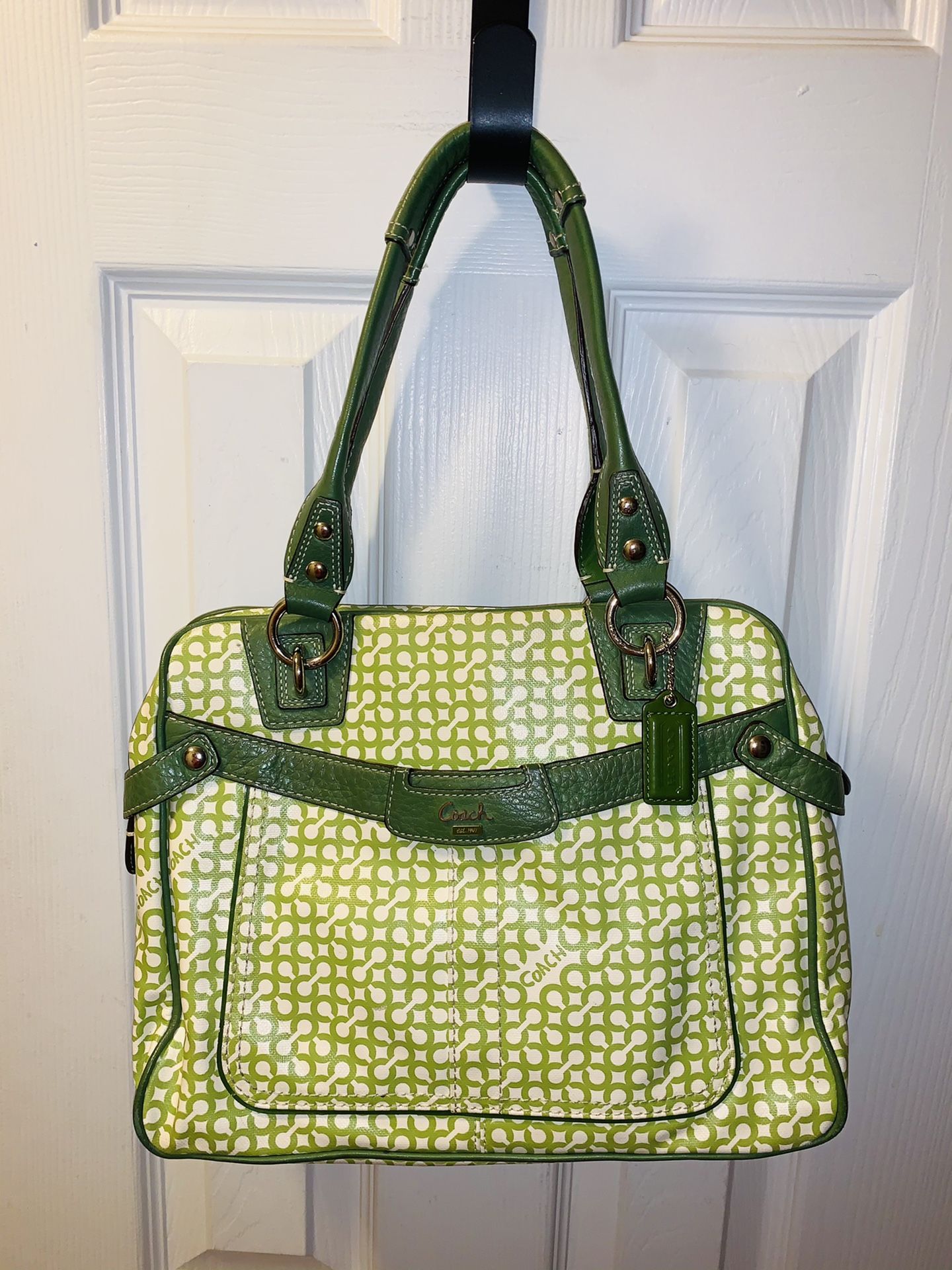 Green and white print with yellow lining. Purse and wallet. Comes with dust bag.