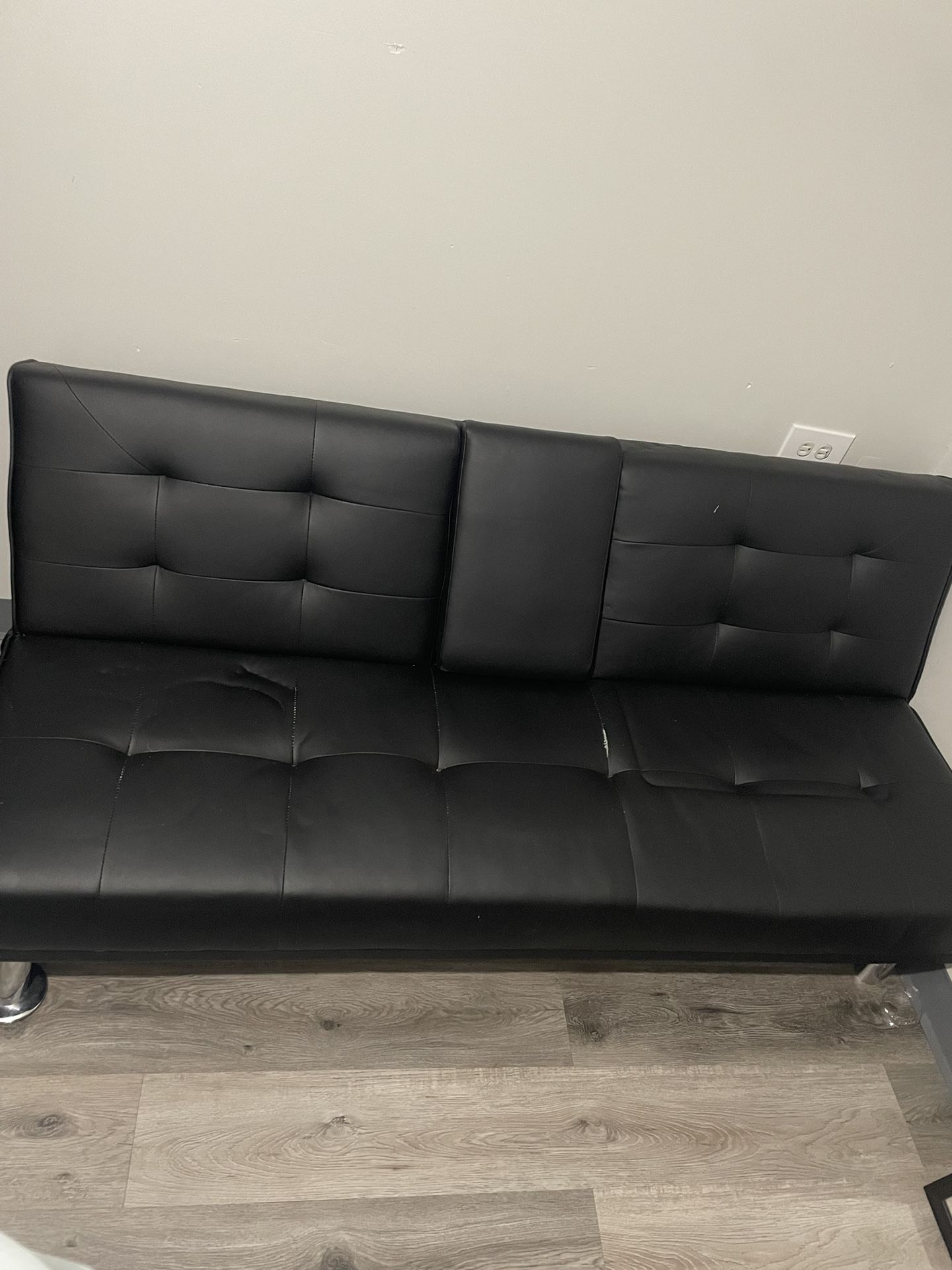 Black small futon. Lays down to a twin size bed.