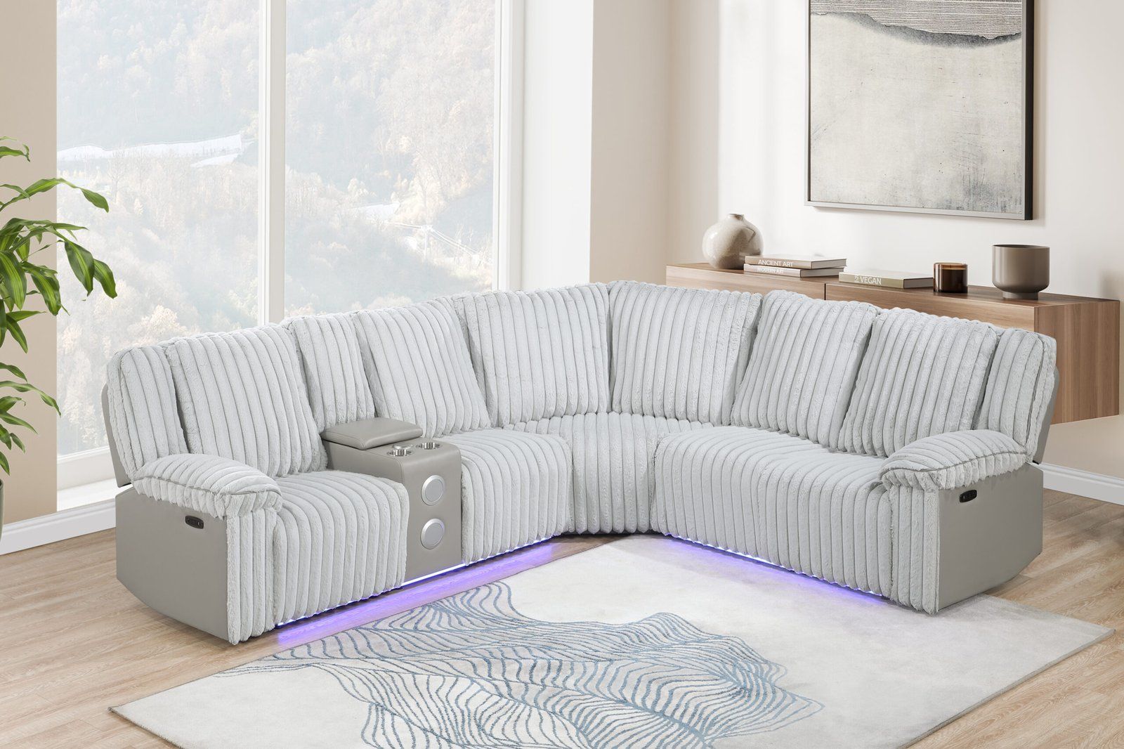 A luxurious brown power reclining sectional featuring channel tufted fabric, tube LED lighting, Bluetooth speakers, and Zero Gravity comfort.