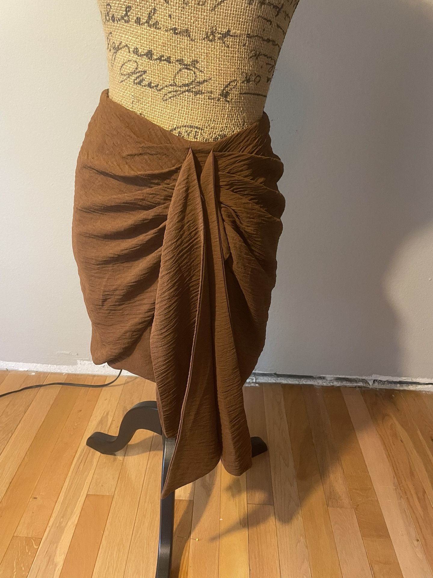 Cute little skirt can be worn couple of different ways It’s a light chocolate brown Side or back zipper tie or let hang Size S it has some stretch, but not much