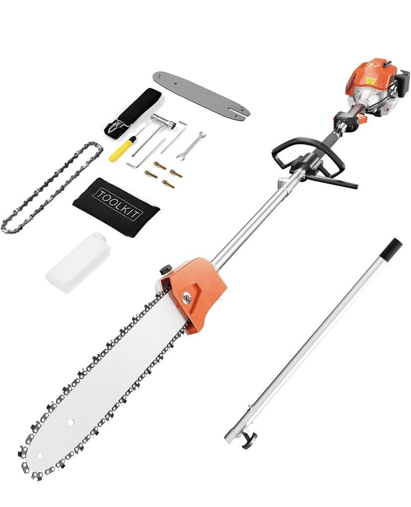 New in the box SKU: ATCL-HYGXBI048O Powerful Engine:Our gas pole saw is equipped with 2-stroke engine which can provide greater power,and can speed up to 3000r/min,with the 11.5'' blade you can easily cut trees Adjustable Length:The power pole saw with 2.7ft extra pole together,which can easily extend from 7-9.5ft by extension pole to cut different height tree Labor-saving Design:With the ergonomic front handle and double padded shoulder straps, which allow you to work on larger areas quickly and effortlessly Safety Use:In case of emergency,strongly pull the white tap at the hook.The machine will be released from the strap.Recommend the fuel mixture ratio of oil to gasoline is 1:25 Warm Tips:Our gas chainsaw needs maintenance when you use it about 10 hours.Use soap and water clean thoroughly the air cleaner element and reassemble.Besides, clean the spark plug to prevent dirt and dust from getting the engine's internal parts