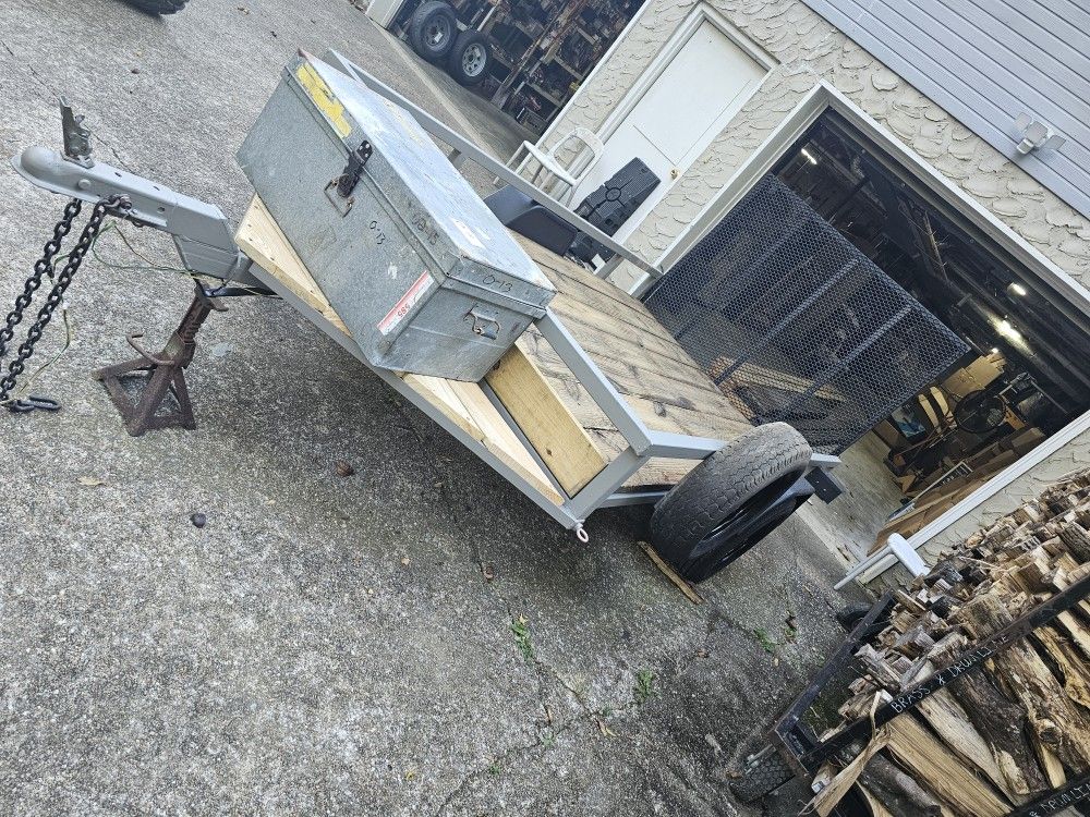 Nice utility Trailer very strong 5.5 x 10 foot with drop gate has brand new LED lights on it. New tie down hooks.... fresh paint. Added a locking tool box up front ...tires are good.... comes with safety chains. 2 inch coupler.... Comes with a spare