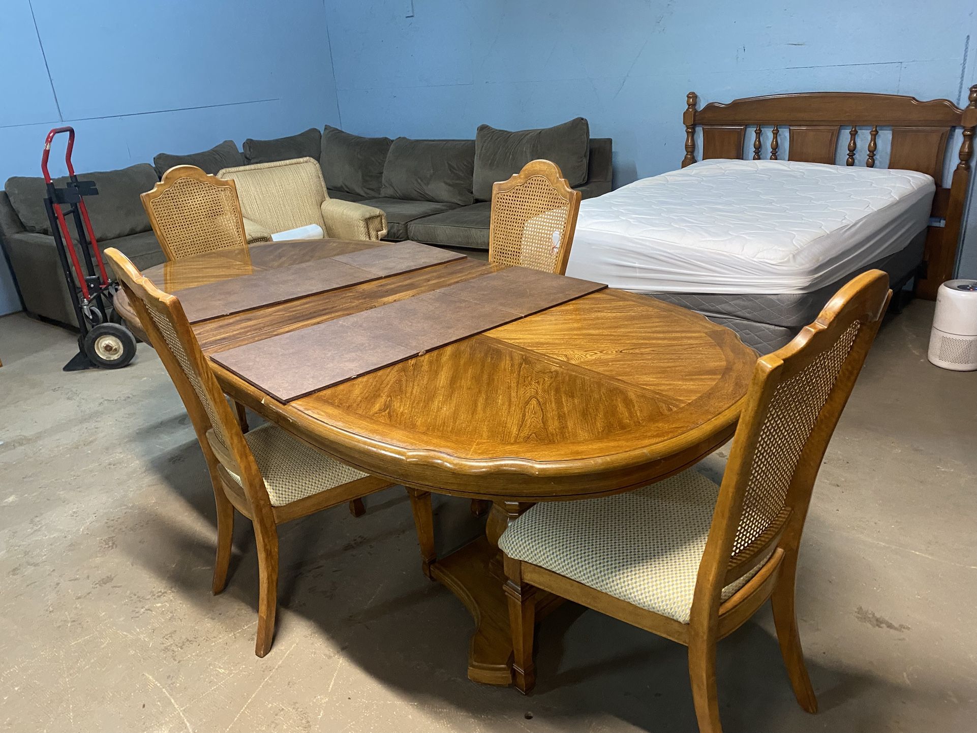 - $60 front porch delivery within 20 miles of 46218 - Round wooden dining table with four matching chairs. - Has 2 leafs - With 2 leafs is 98in Long, No leaf 65in long, 30in tall, chair 43in Tall X20inW - Meet by appointment only
