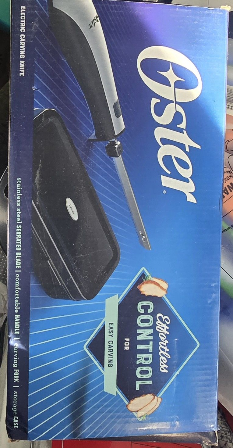 New in box poster electric carving knife with carving fork and storage box