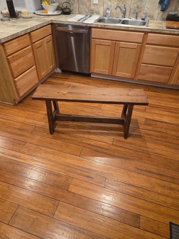 Beautiful handmade solid wood bench with a warm, rustic finish. Sturdy and well-built—this is not a flimsy piece. Works great as a dining bench, entryway bench, mudroom seating, or even at the foot of a bed.