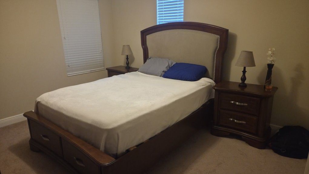 Queen size bedroom set with dresser, 2 night stands, 2 lamps and a new mattress. Must have your own man power to move from 2nd floor house.