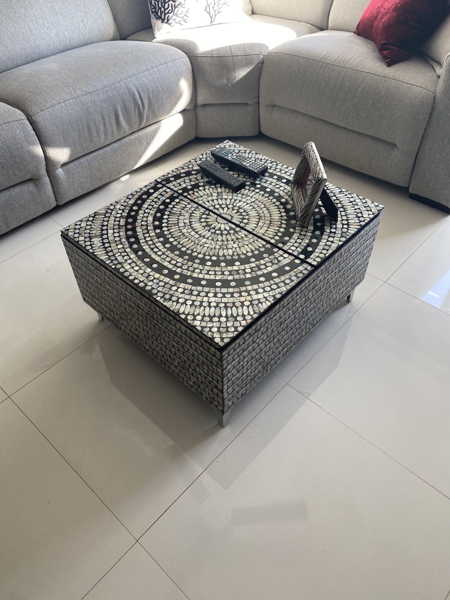 Two doors open up with storage. Doors have a mosaic design and cabinet has silver feet