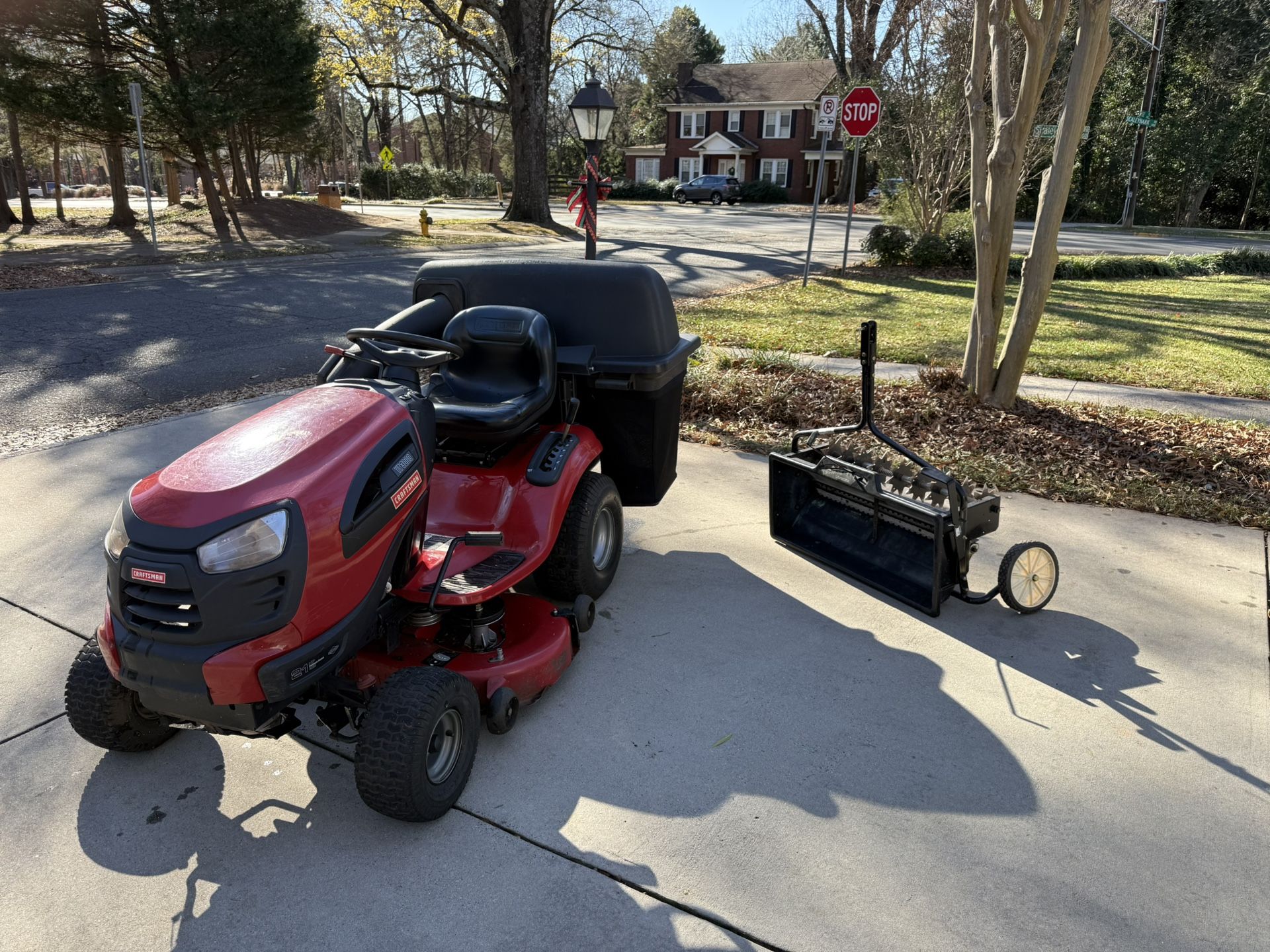 Craftsman 21HP 42” mower with bagger, aerator/seeder. Electric start, auto transmission. New battery