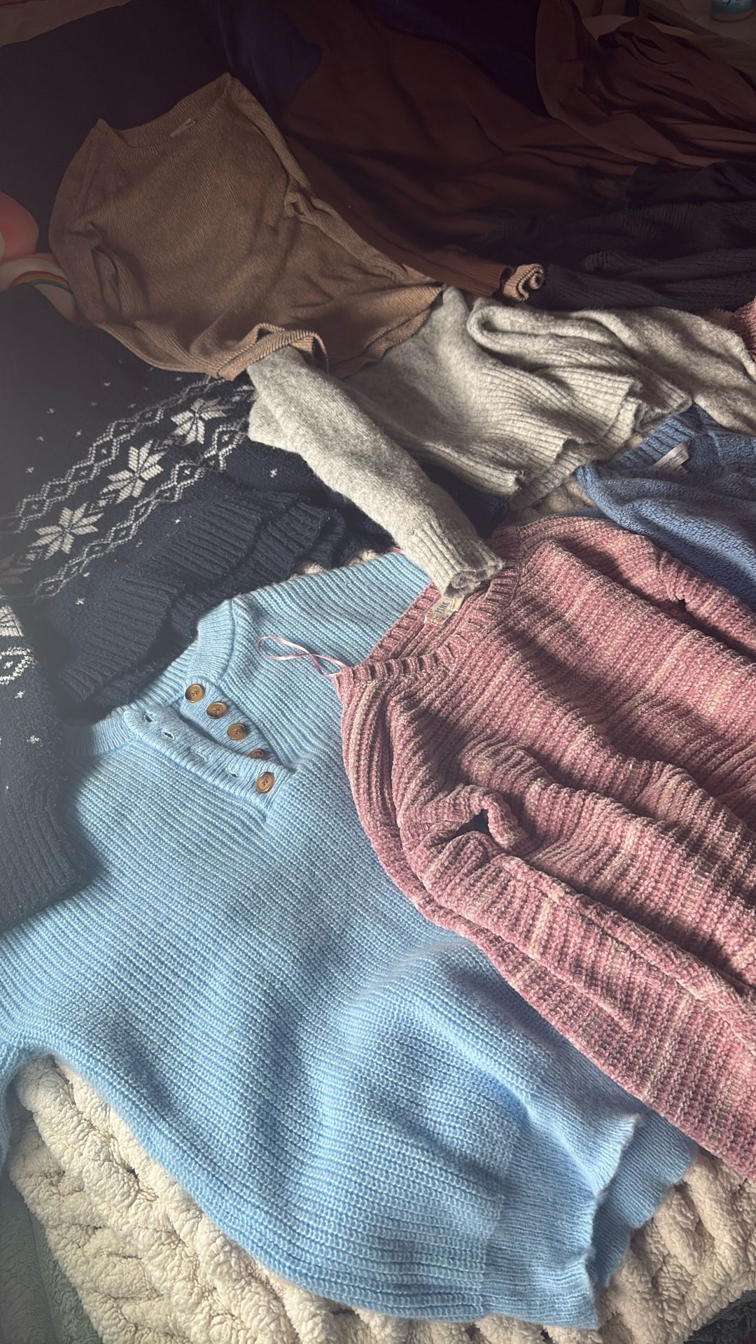 I have 10 super cute cozy long sleeve soft knit sweaters, size medium, great condition. Light wear, there is 1 long brown cardigan, 1 thick long sleeve turtleneck, and 8 thick and cozy sweaters. Pickup in Lacey, cash only :)