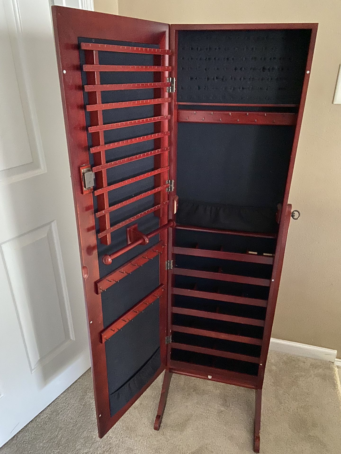 Very nice jewerly armoire. Store it all in one place rings, earrings, bracelets, necklaces and watches, each with its own compartment really nice,.