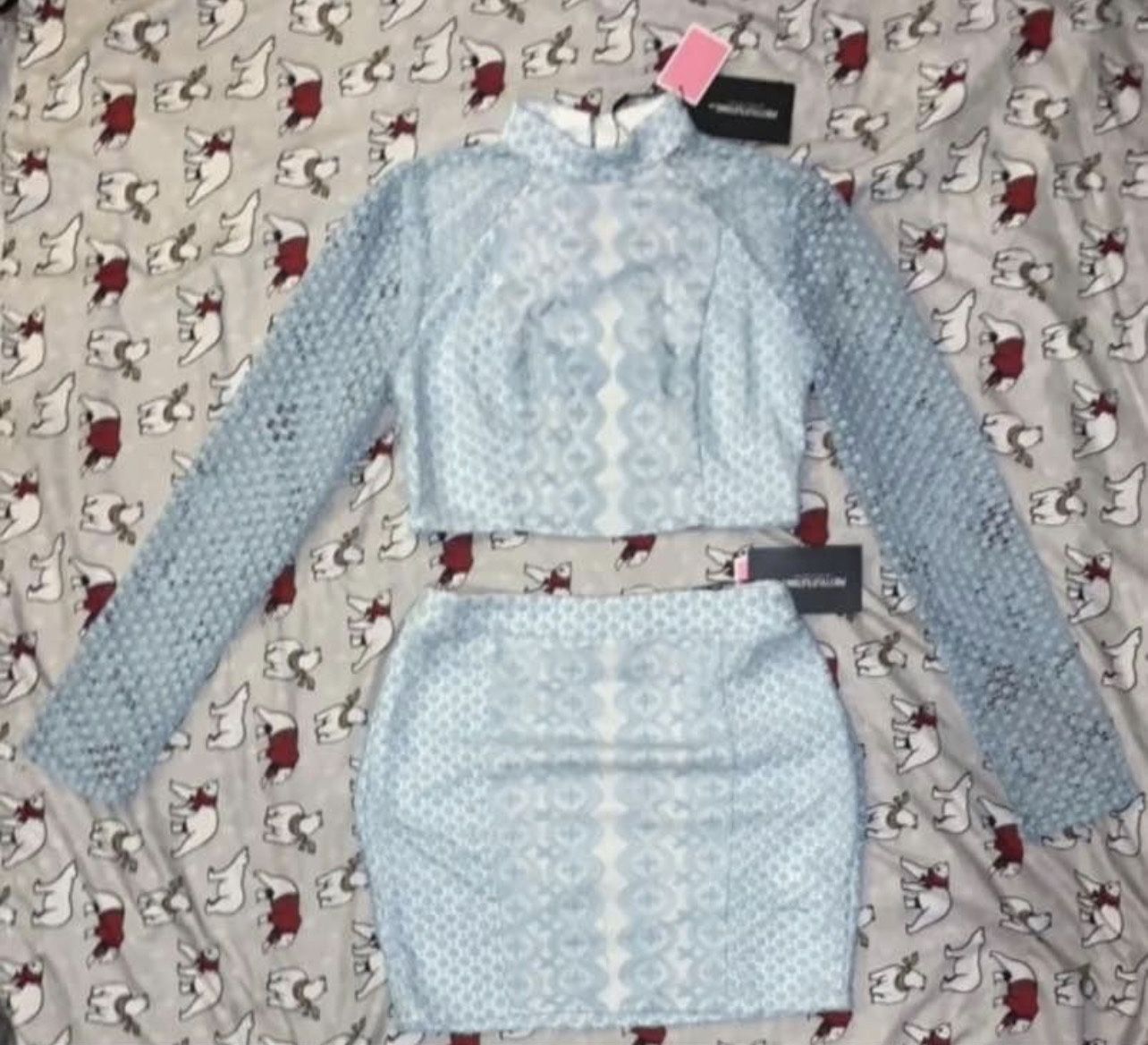 Brand new size small, true to size skirt is high waisted and top has semi-sheer sleeves, set does not have stretch.