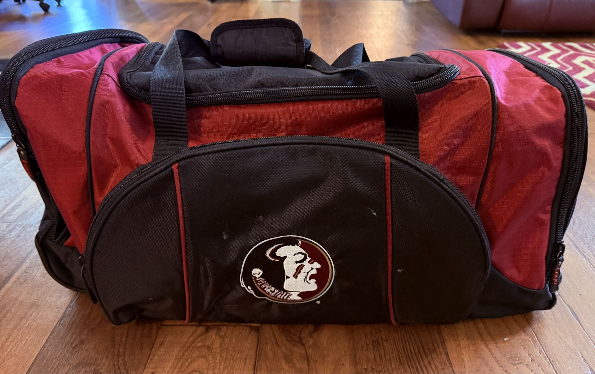 Logo Athletic Florida State FSU Seminoles Wheeled Duffle Bag Luggage. Excellent condition. The color is black. You can carry it like a duffle bag with the fabric handles or wheel it behind you like a carryon piece of luggage.