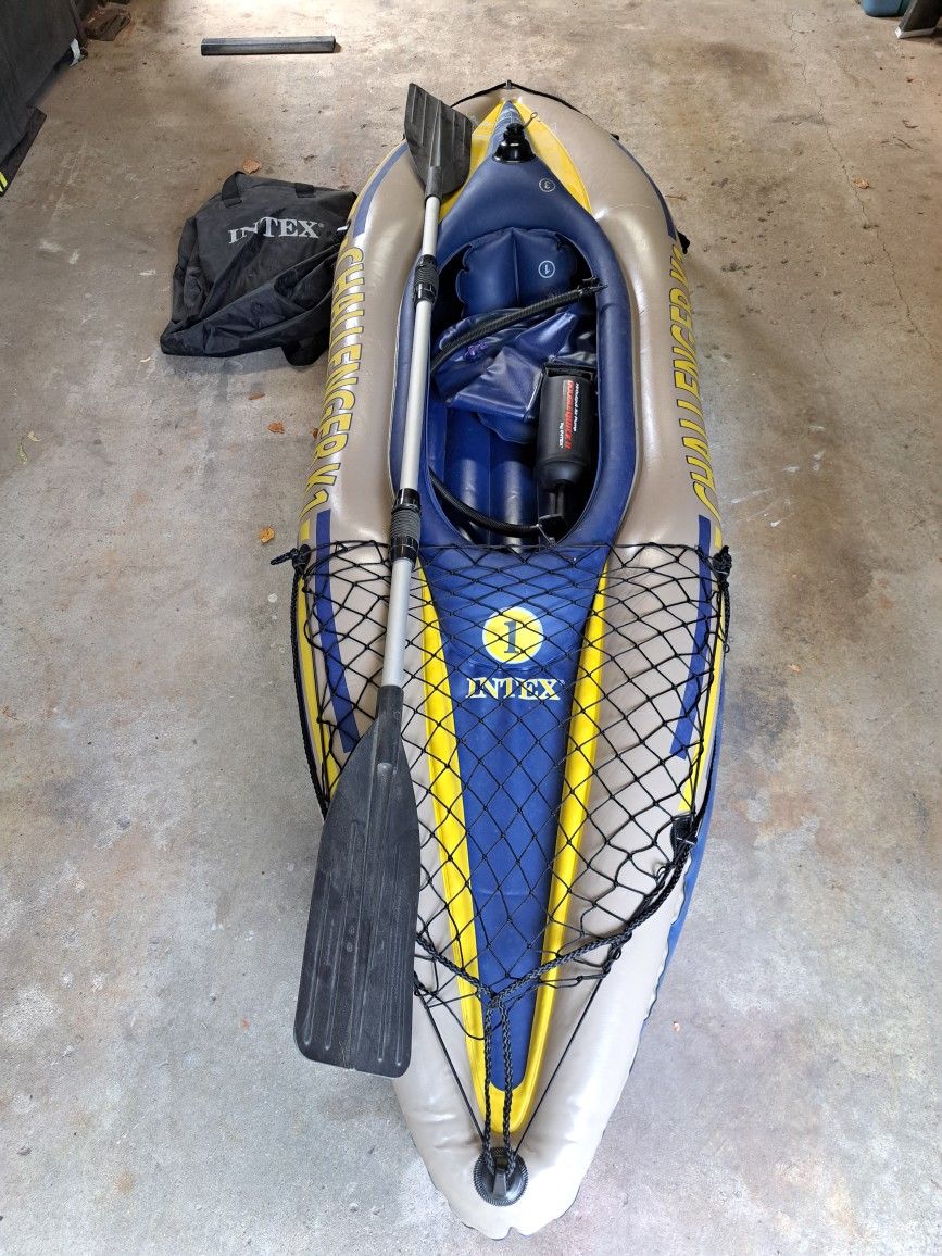 Inflatable Kayak for one person - includes pump, oars, instruction manual and carrying bag. Inflates quickly - overall in great condtion.