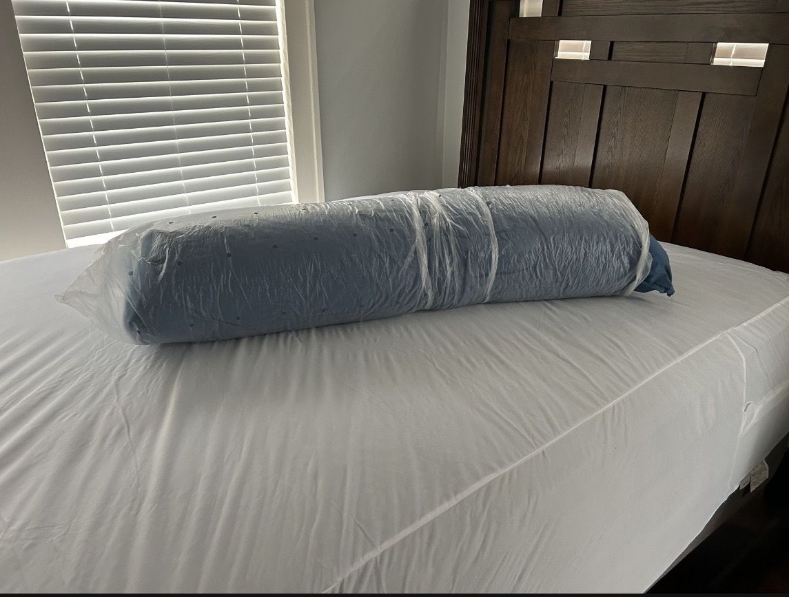 Extra-long body pillow in excellent used condition. This pillow is very soft and supportive, great for side sleepers, back support, pregnancy, or lounging. The pillow includes: • Removable zippered blue cover (machine washable) • Inner pillow insert (white) filled with 100% polyester fiber batting • Pillow fluffs back up well after use (see photos)
