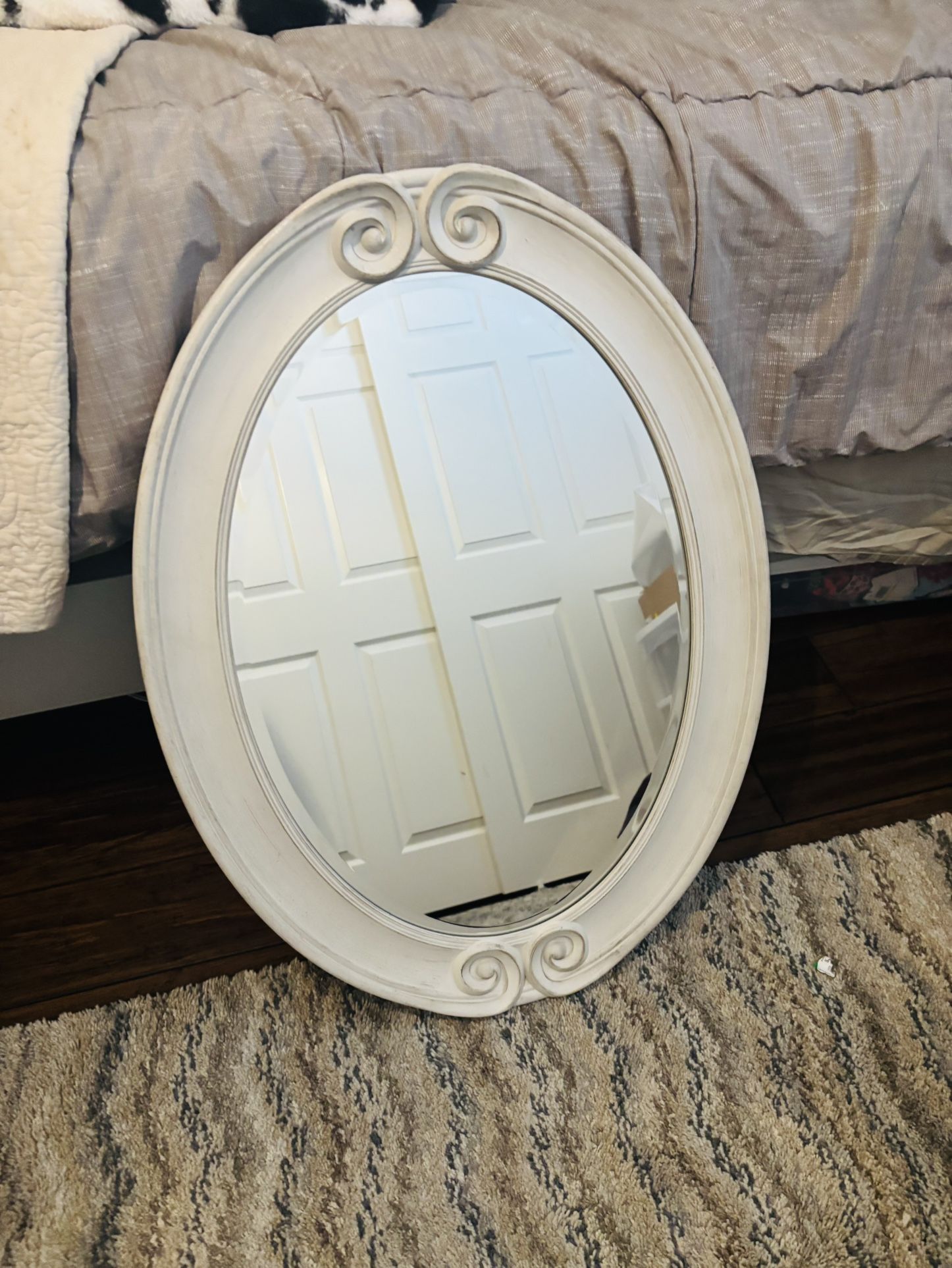 decorative off white oval mirror beveled very good condition can hang horizontal or vertical approximately 29”x 21”