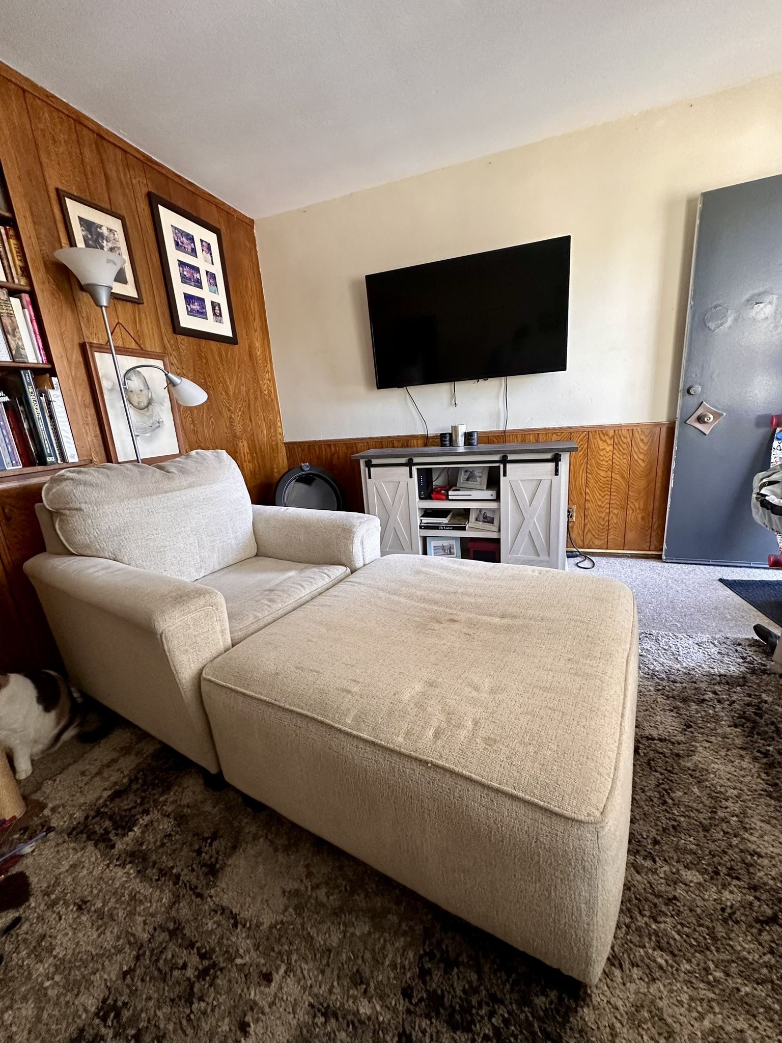 Ashley Abinger oversized chair and oversized ottoman in color 'natural'. Bought in 07/2021. Vacuumed weekly but normal wear and tear for mom, teen, and cat. Ottoman is big and about the size of the chair. Great for snuggling, reading, and sleeping! Photos show the actual chair and ottoman, as well as the current sale at Ashley Furniture (they only have the gray color now). Dimensions in the Ashley photos.