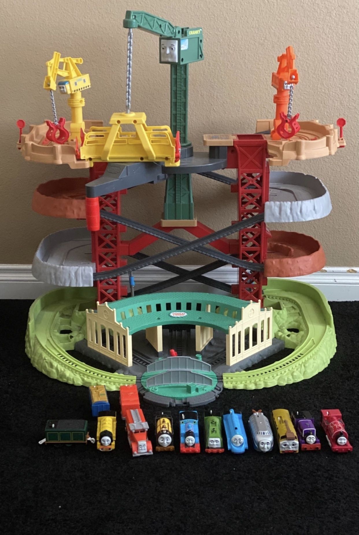 Pre-owned Thomas & Friends Multi-Level Track Set Trains & Cranes Super Tower with 10 motorized trains (6 working with batteries, 4 didn’t work with batteries)